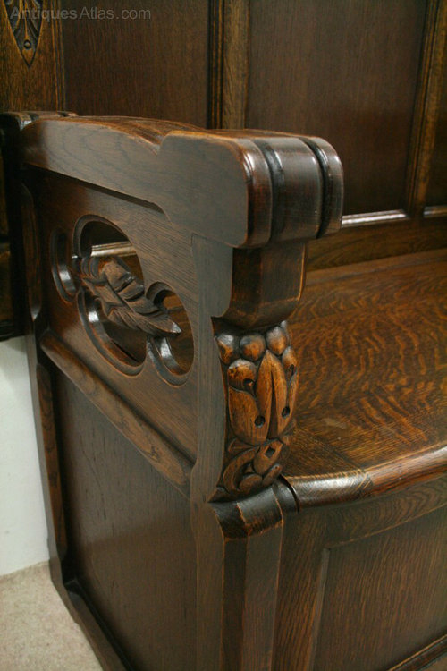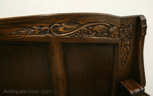 Circa 1930, very stylish Art Deco oak monks bench. The top has 3 fielded panels with chamfered sides, is hinged and slides back to reveal a lovely chair back with carvings and fielded panels. The bench has a large bow front seat with a hinged solid oak top opening to show a massive storage space inside. The arms are chunky with ribbing and open fretwork carving on the sides in the form of a diamond. There are fielded panels again on the sides and front, and foliate carving in the centre over an unusual stylised base. The whole piece stands on a pair of squat trestle bases. Excellent colour and condition.