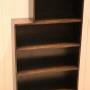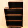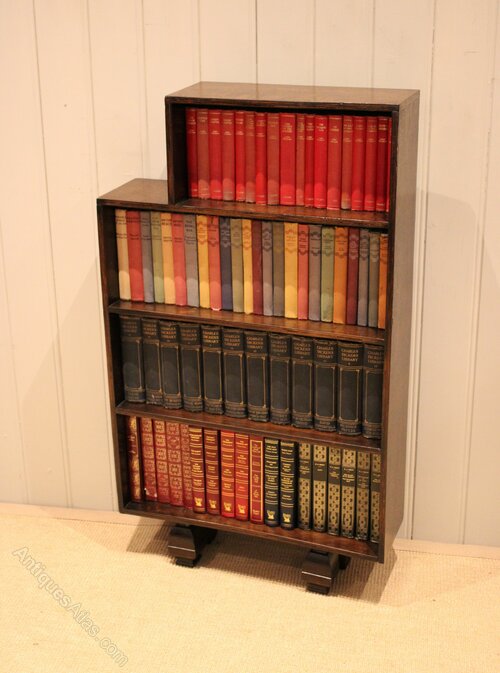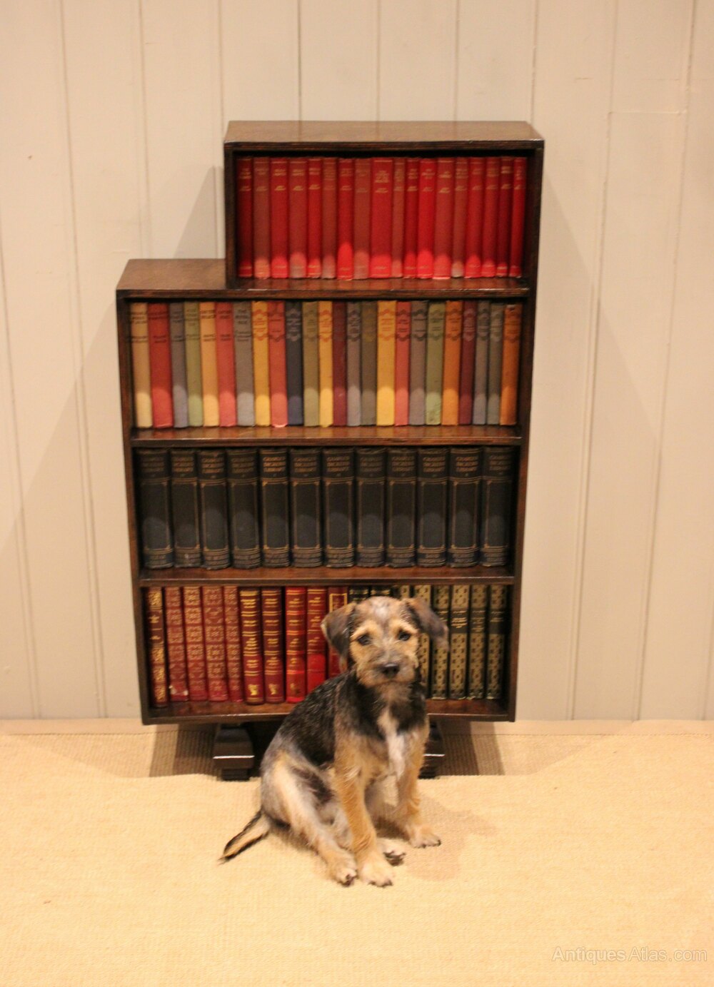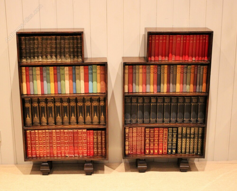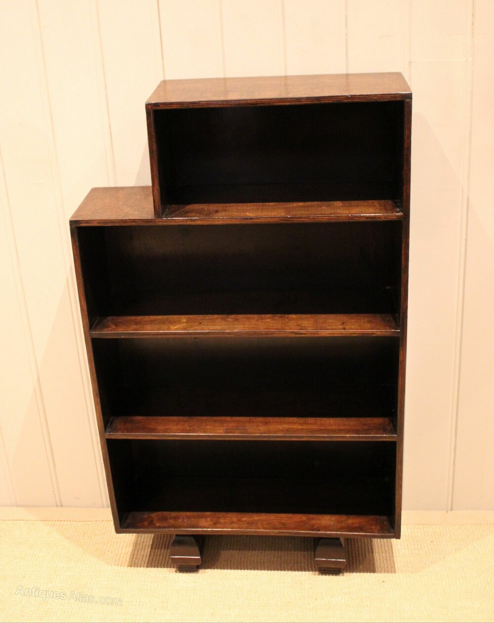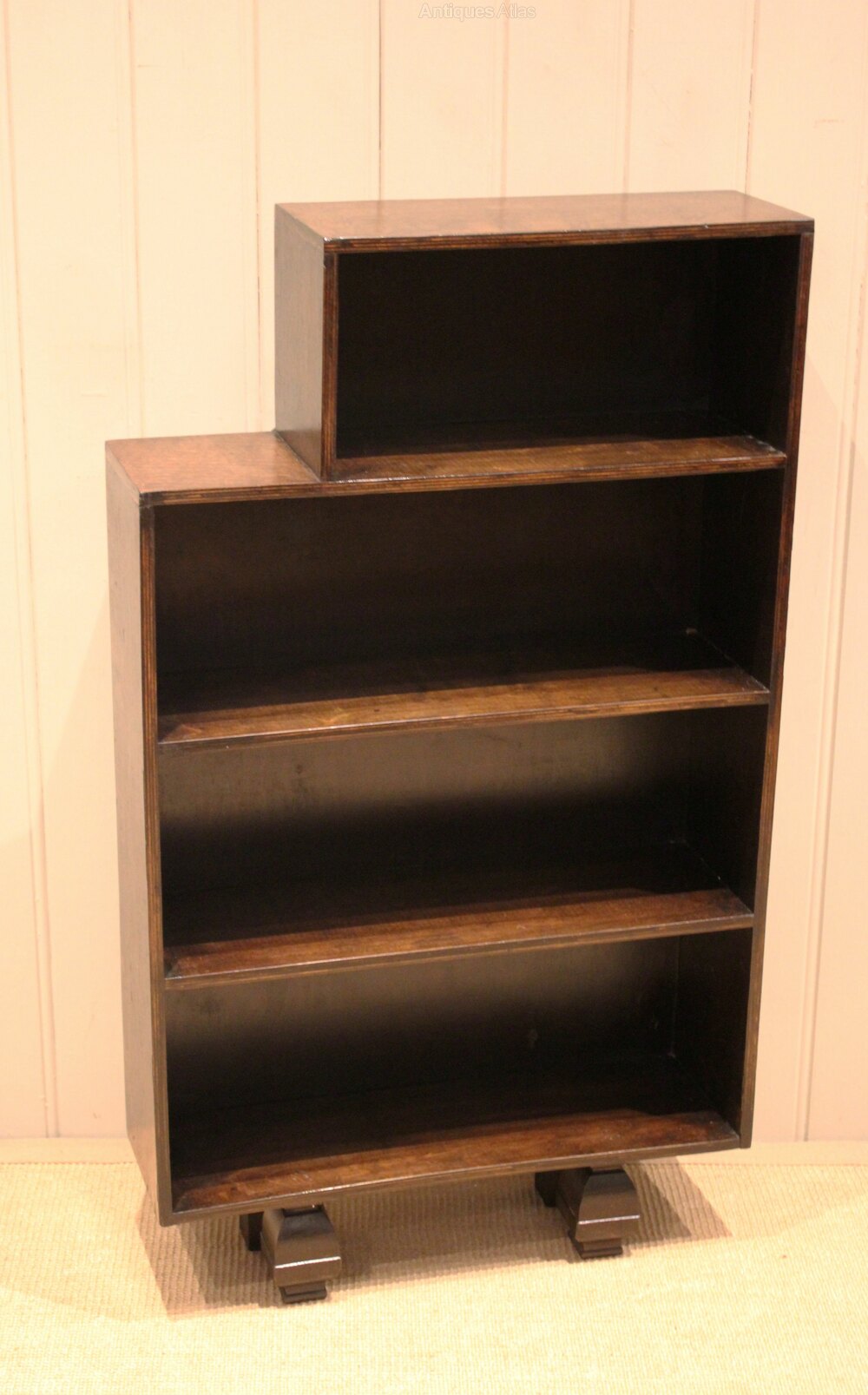 Art Deco style oak sectional open bookcase having four fixed shelves , raised on shaped feet . The shelf dimensions are 17.5 cm deep and from the bottom up 56 cm wide x 22 cm high , 56 cm wide x 21 cm high , 56 cm wide x 20.5 cm high and at the top 40.5 cm wide x 19 cm high . Pair Avaliable