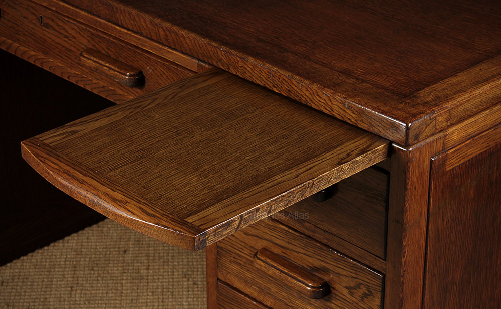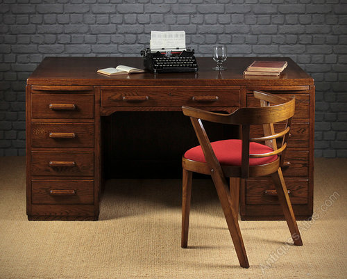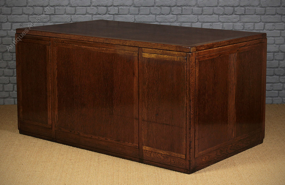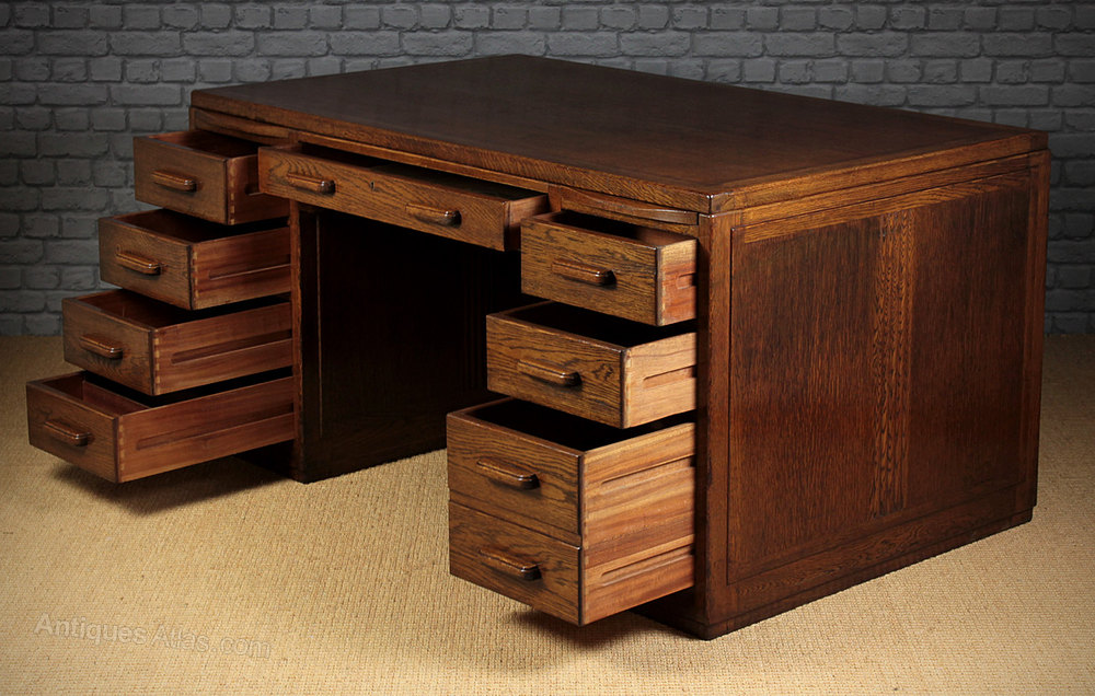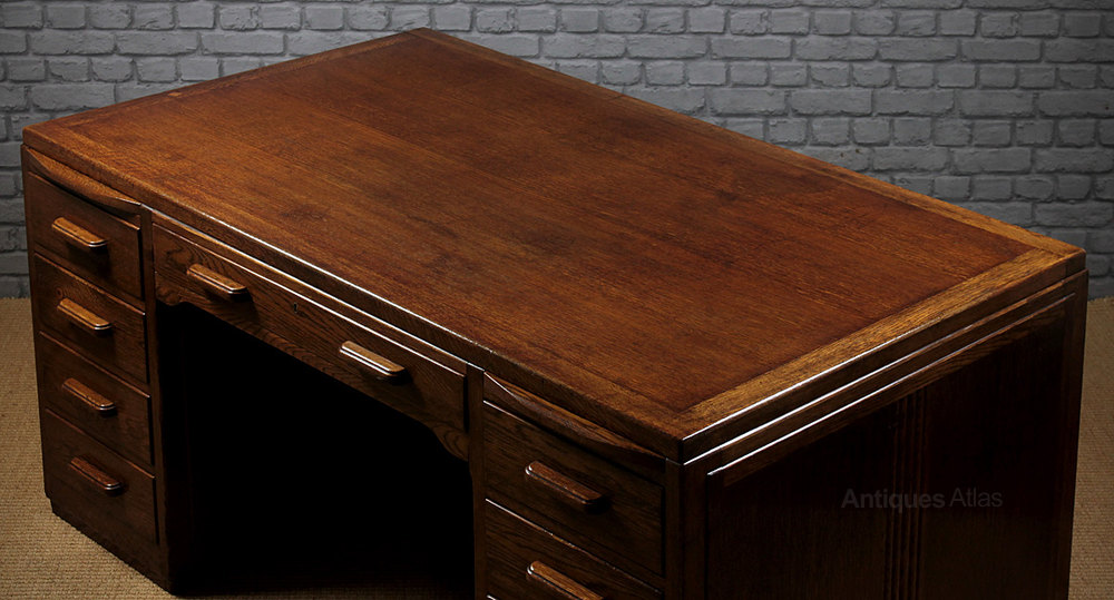 Stylish Art Deco oak pedestal desk c.1930 of good large size and a striking modernist or machine age design. 5′ x 3′ desktop over drawer pedestals with a writing slide to each and single large drawer above the kneehole. The lower right hand drawer is double height for files etc. Good period detail to the stepped top edge and reeded centre to the side panels. Of superior quality with solid oak drawer fronts and solid mahogany drawer sides. Also polished on the rear face meaning the desk could stand in the centre of a room rather than against a wall. Excellent condition, cleaned and polished in our workshops. Key supplied. Note with the centre drawer closed all eight other drawers are automatically locked closed. Push in the centre drawer to release the lock mechanism.