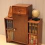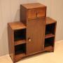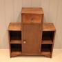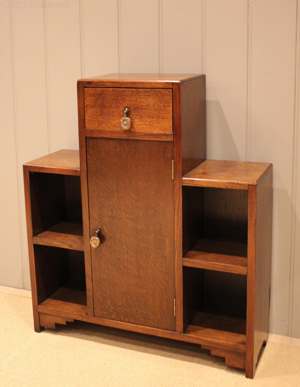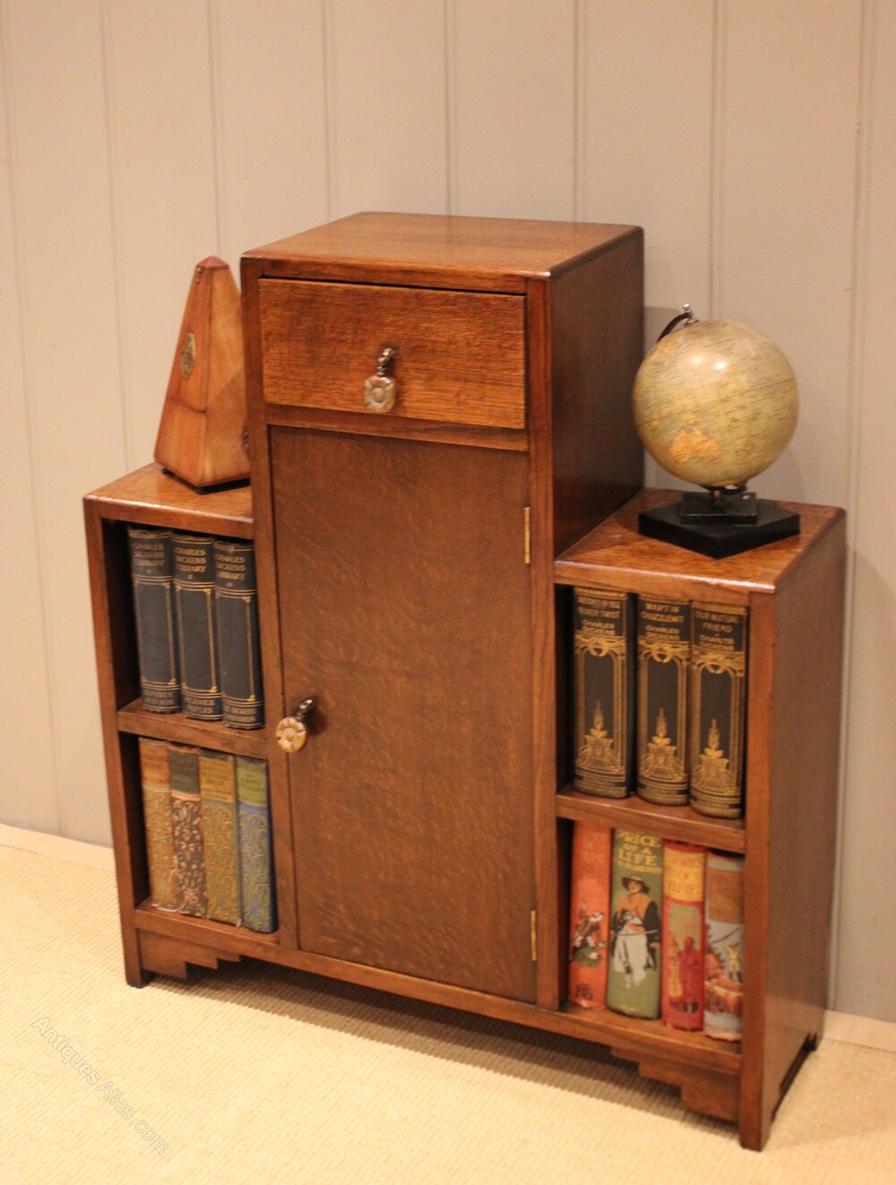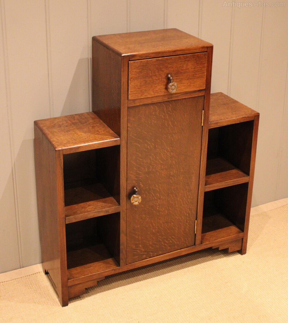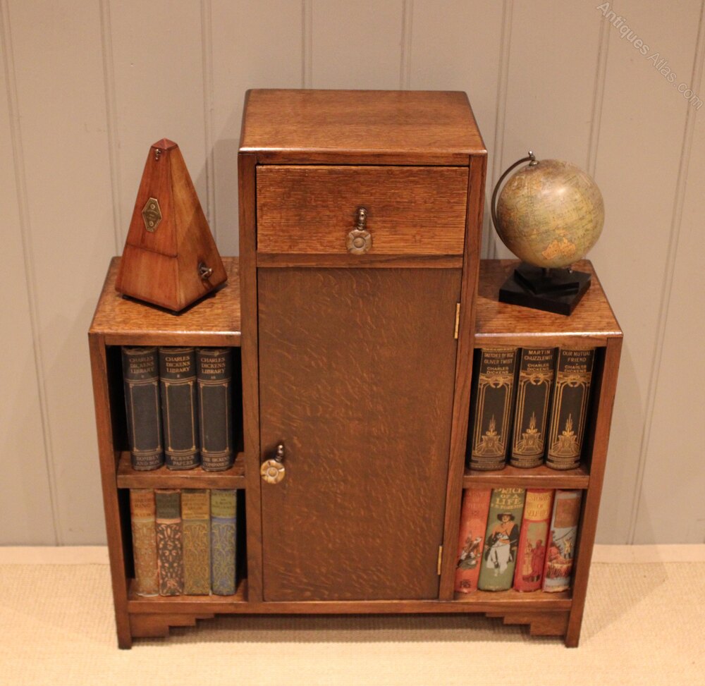 Unusual Art Deco oak cabinet bookcase having a central cupboard below a single drawer , flanked by two open sections , raised on bracket feet . Each open section measures 20 cm high , 20cm wide and 7.5 sm deep.