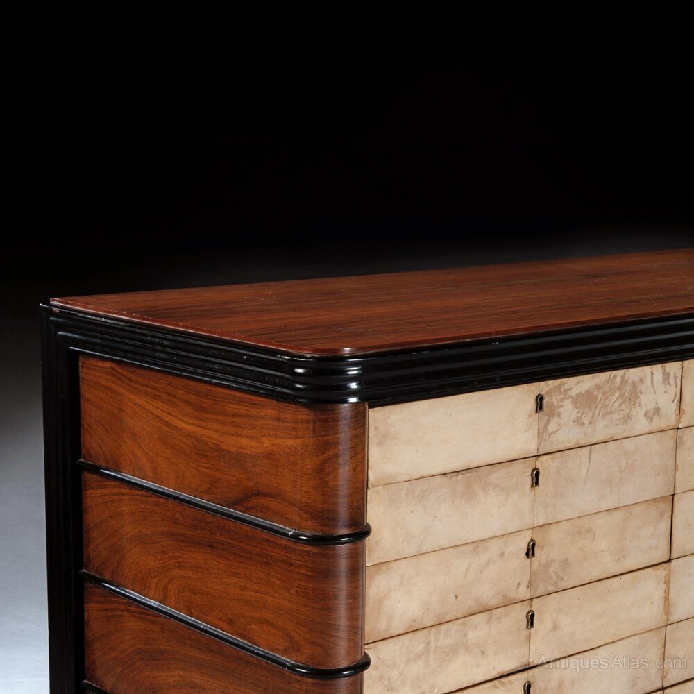 This piece dates to the 1930s and is therefore an early piece of Art Deco furniture with evidence of the new taste but with the rounded lines also looking back to classic pieces of the 19th century for inspiration. The use of parchment in combination with palisander is quirky and luxurious and recalls the work of the great designer Jean Pascaud who used precisely this same combination on a number of commodes produced in Paris in the 1930s and 1940s. Although a firm attribution is not possible, the present piece is certainly of the level of quality associated with Pascaud and would have been produced in a major French workshop of the period combining the latest manufacturing techniques with classic materials. The commode exudes luxury and fine proportion in equal measures.