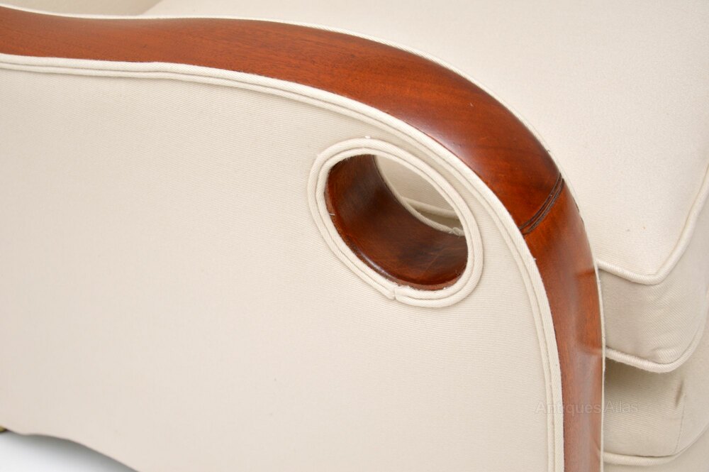 The condition is superb, we have had the wood completely stripped and re-polished, this has also been fully re-upholstered in our cream cotton fabric with plump, feather filled cushions. We also have the matching pair of armchairs available separately, seen listed under our other items for sale.