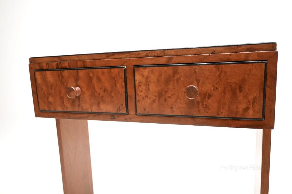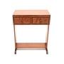 This is of wonderful quality, it is quite low and petite, with two useful storage drawers. It has a beautiful design, particularly the way the legs attach to the main carcass, and the gorgeous grain patterns on the drawer fronts. This is also nicely finished on the back, so can be used as a free standing item.