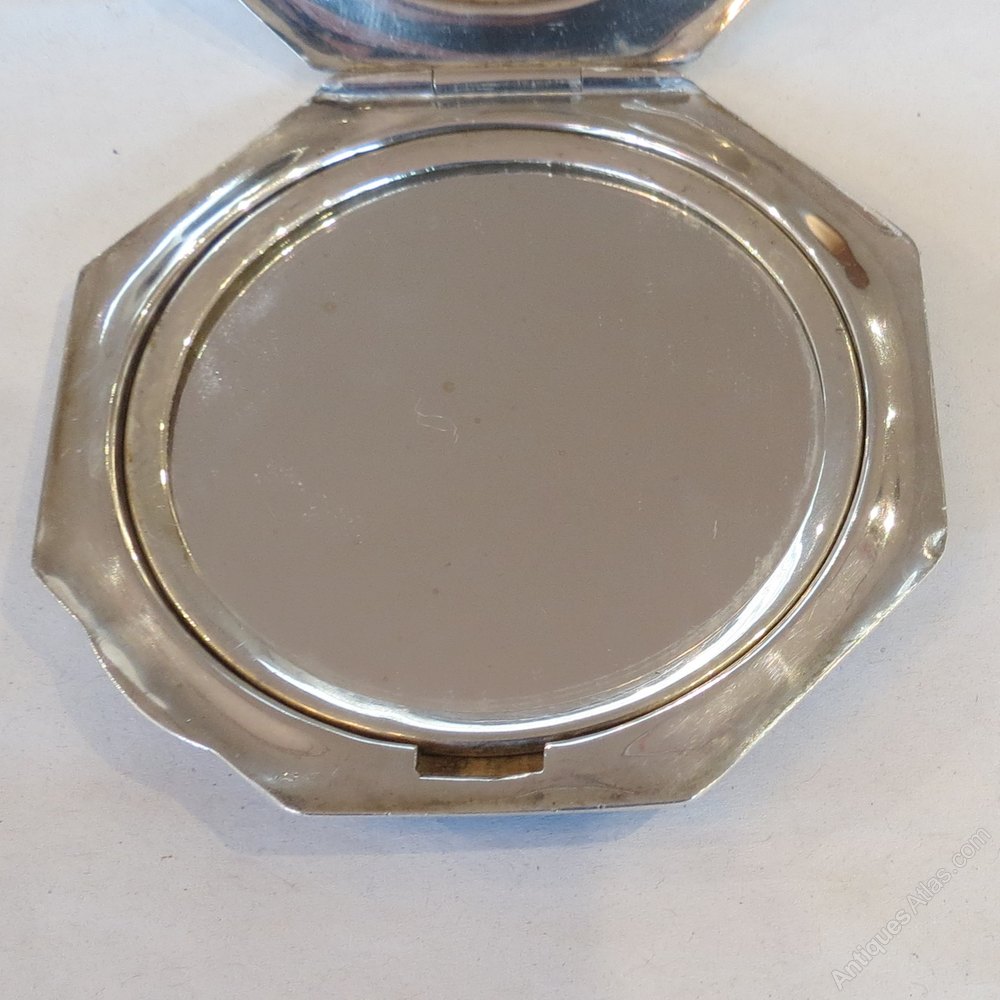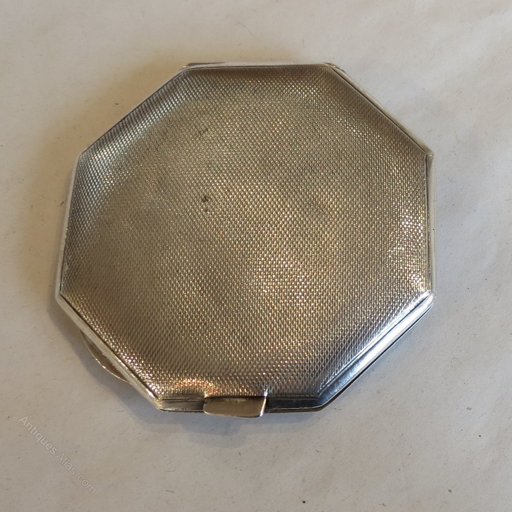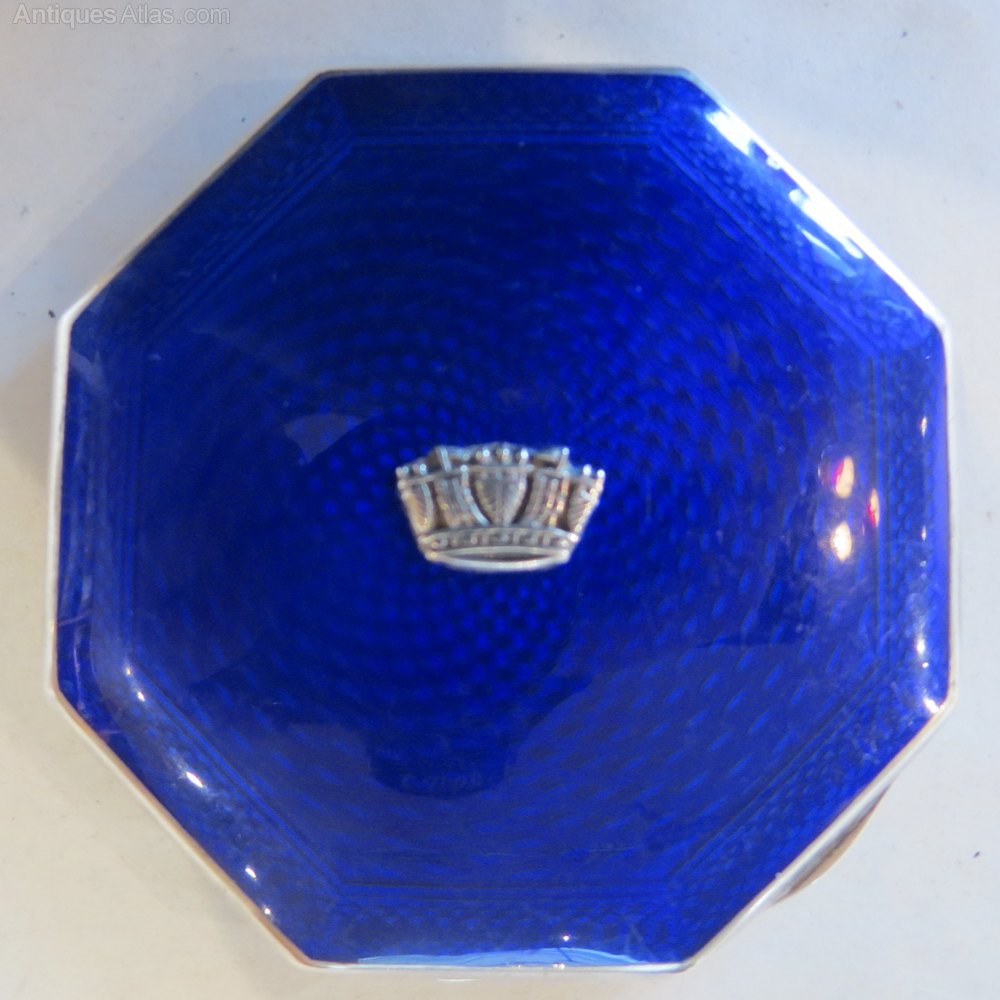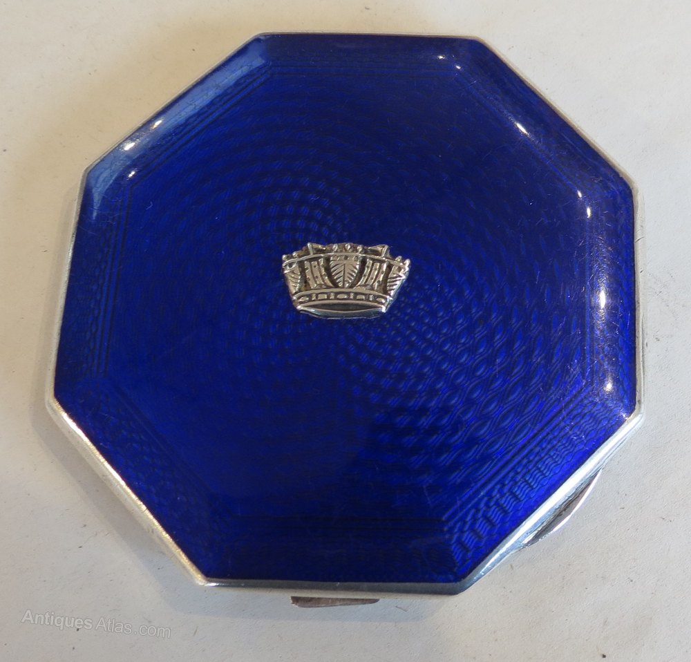 An octagonal Art Deco, silver and blue guilloche enamel compact which is covered in royal blue enamel and decorated with a cast Naval crown. Engine-turned bottom.