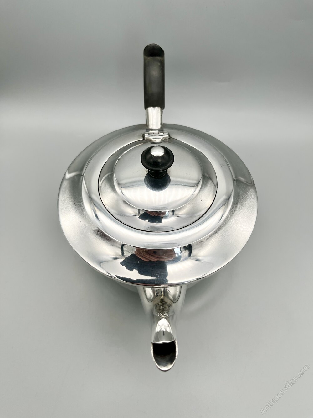 Here we have a top quality Art Deco Sterling Silver Teapot. The circular teapot has a flat base and upright body which flares out to a stepped top and hinged lid. The handle and finial are ebonised wood.
