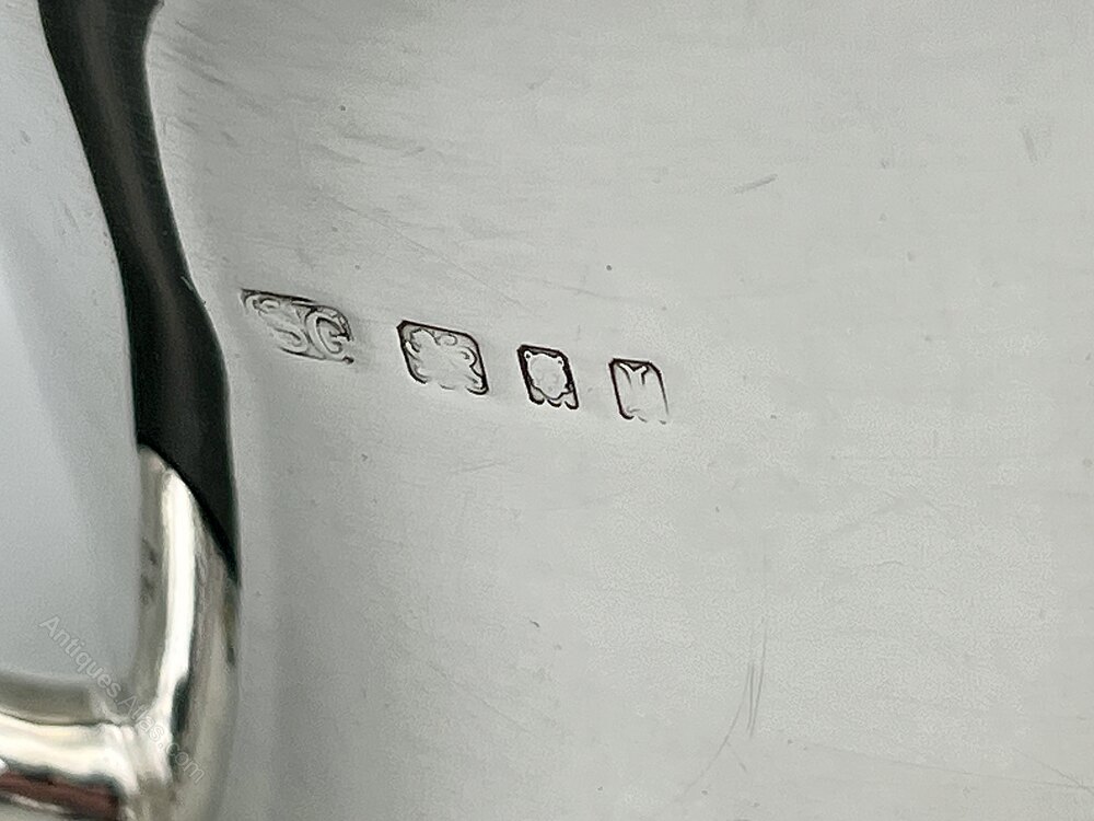 The hallmarks, on the side of the body, are a little rubbed but still clear to read. They show the lion passant for Sterling Silver, the leopard's head assay mark for London, the date letter l for 1926 and the S G makers' mark for Sebastian Garrard of Garrad & Co Ltd.