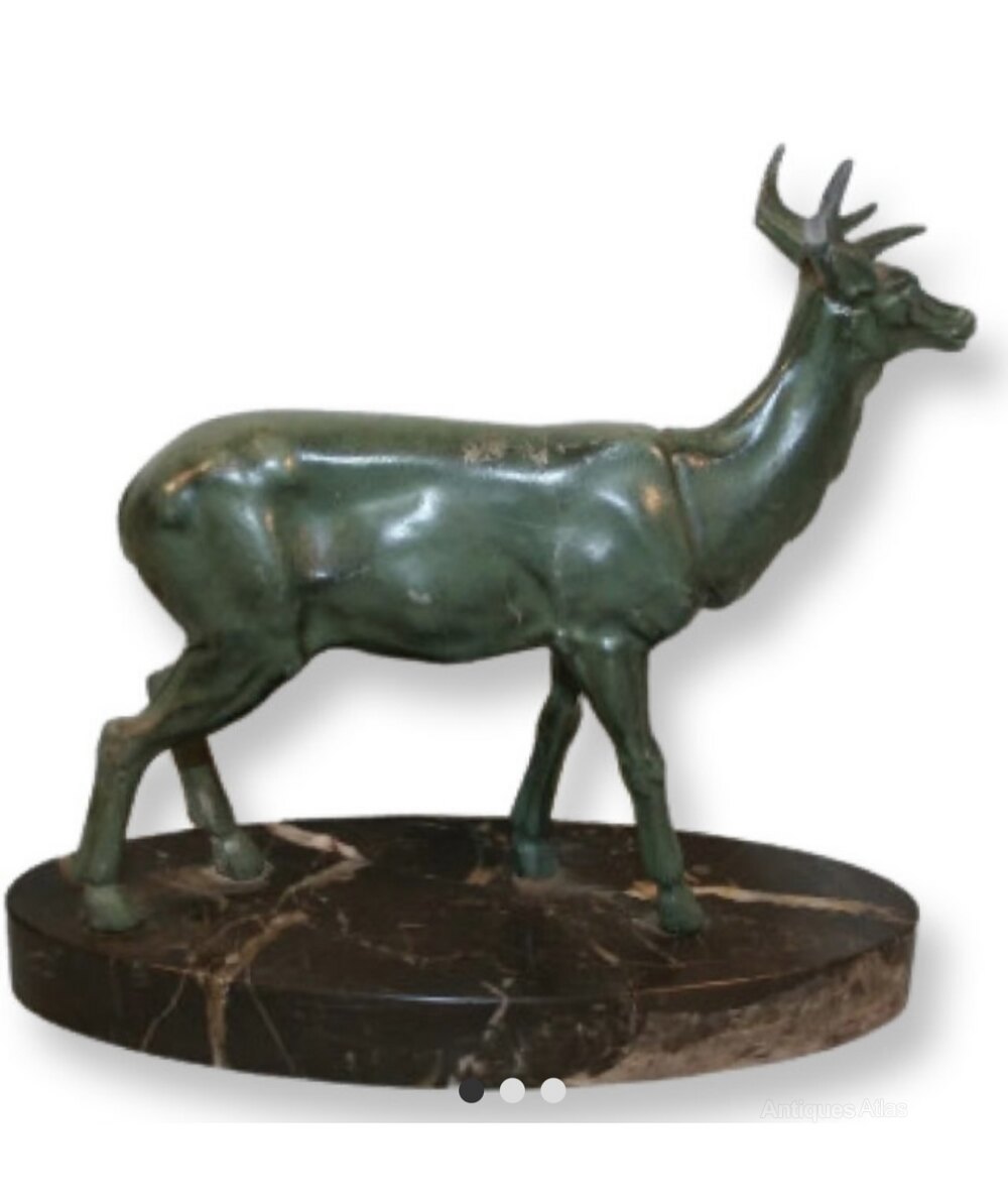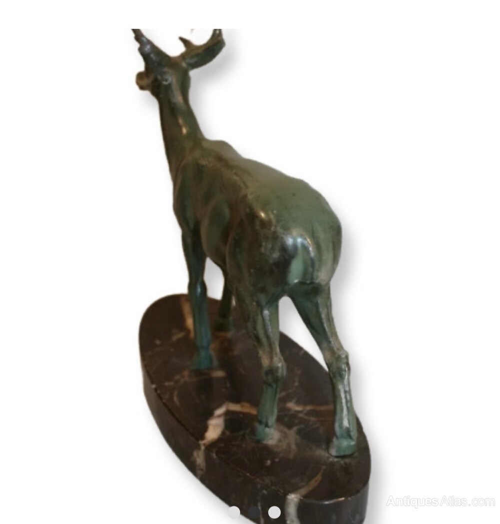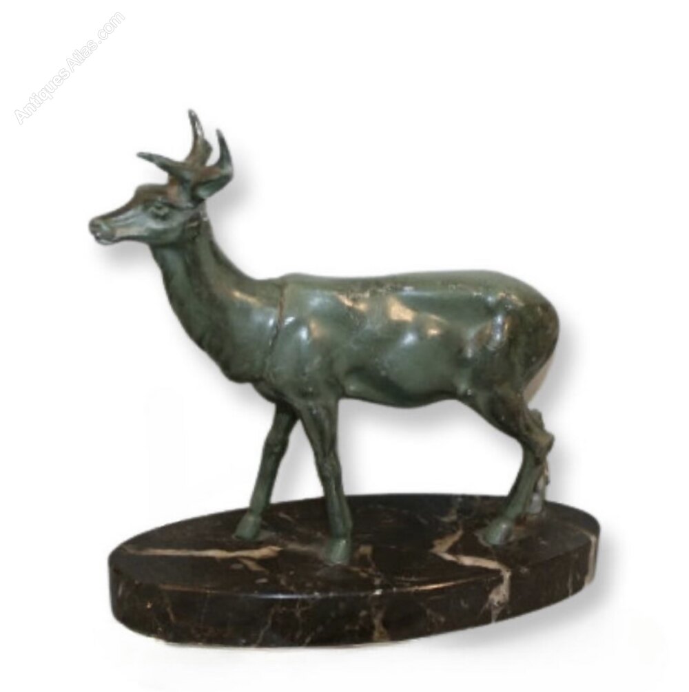 A beautiful English Art Deco Spelter Figure of a deer, with really good detail and definition, stanind on an attractive variagated marble base.