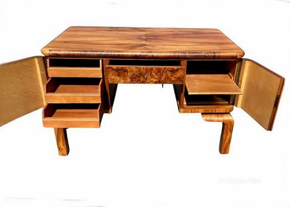 For your consideration is this impressive and totally original Walnut desk dating from the 1930's raised on round shouldered legs. Originating from France, it offers not only functionality but kerb appeal, a delight for the eyes. A generous sized top which is plentiful space for desk top computers ,laptops and general working space. Wonderful walnut figuring to the top too area adding further appeal. In fact all sides, including the legs are veneered & have a very attractive grain. There are four good sized drawers all with beautifully figured walnut veneers. Three running down one and a central. On the other side are two open shelves, also generously proportioned for your needs. We've had this piece professionally restored and French polished so comes to you ready to use and showroom condition. All drawers run smoothly and without effort, no damage to note. We're sure the new owner will be delighted with this piece,