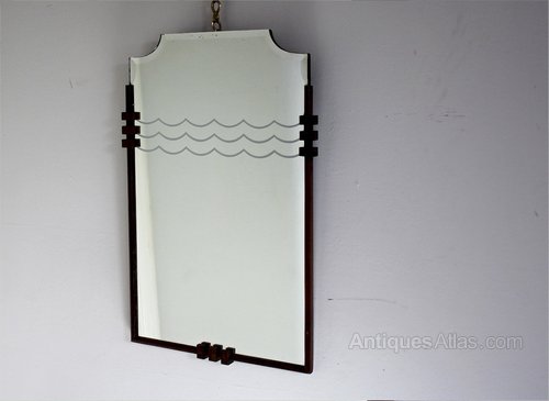 Art Deco wall mirror. Lovely art deco wall mirror with wavy decoration c1930's in stylised mahogany frame. Measures 72 cm high x 49 cm wide