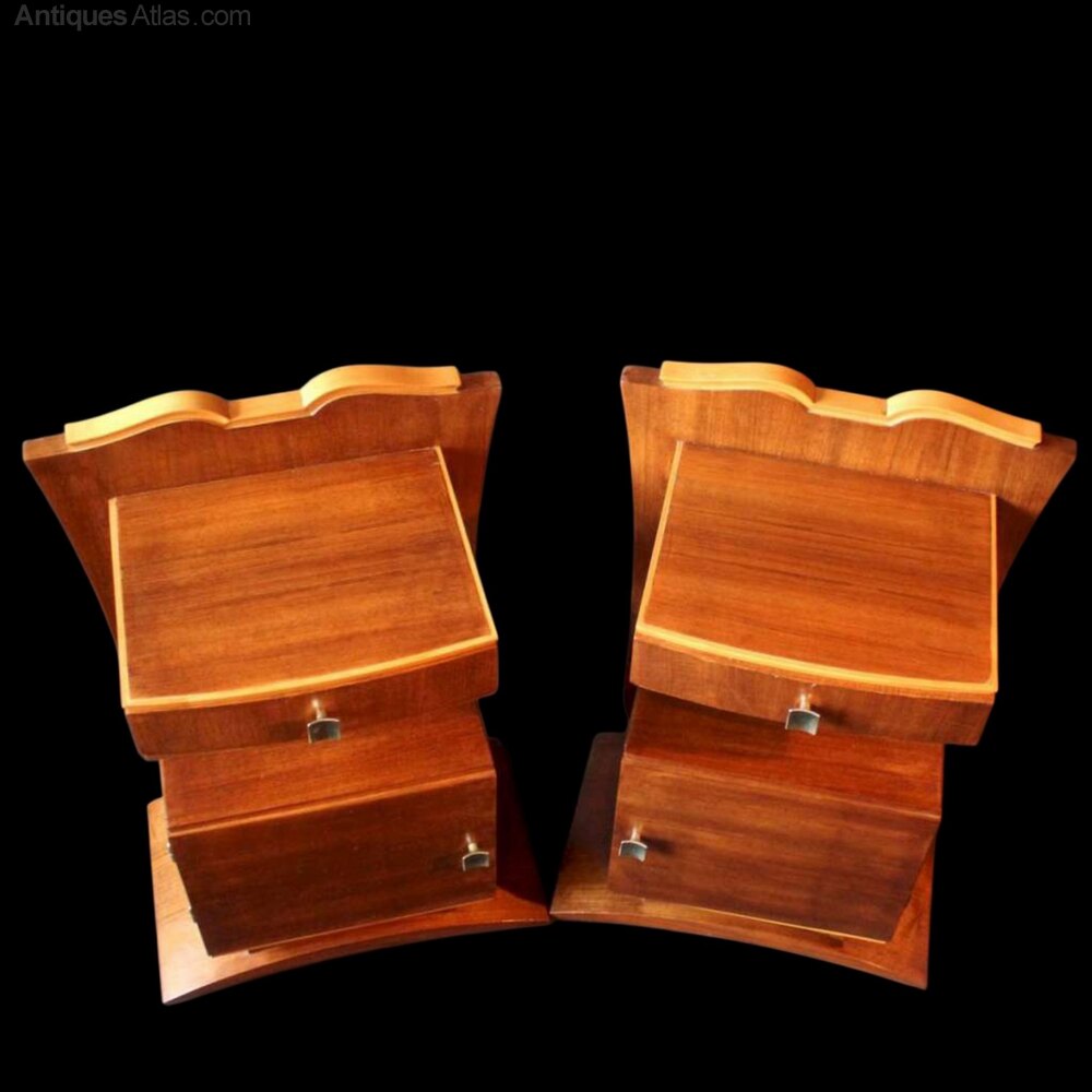 Fabulous pair of 1940's Art Deco bedside cabinets in two tone walnut with sycamore trim. Stylish nickel plated handles. We have had these re-polished. Measures 66 cm high x 45.5 cm wide x 27 cm deep