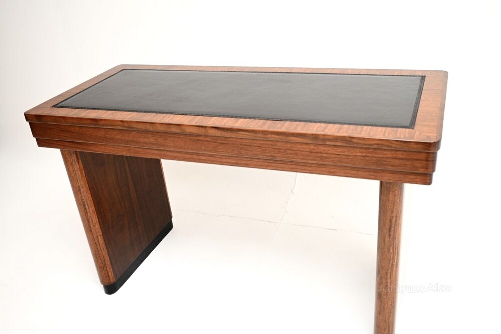 A fantastic Art Deco walnut leather top desk, made in England and dating from the 1930’s.
