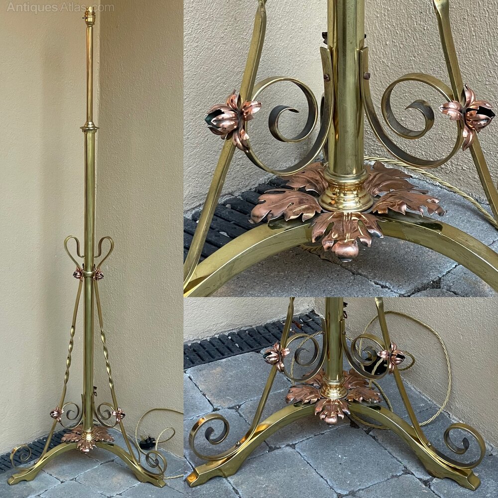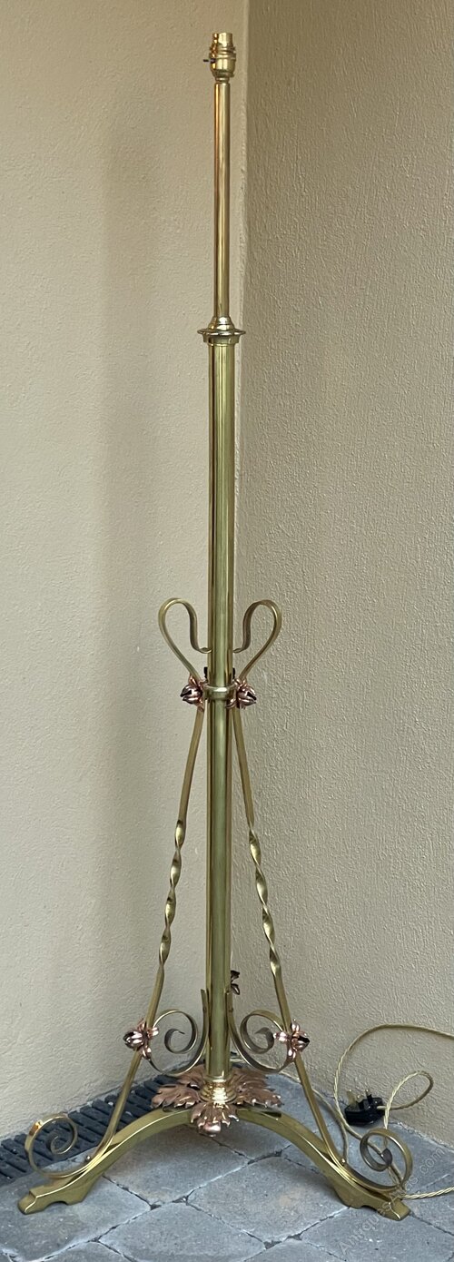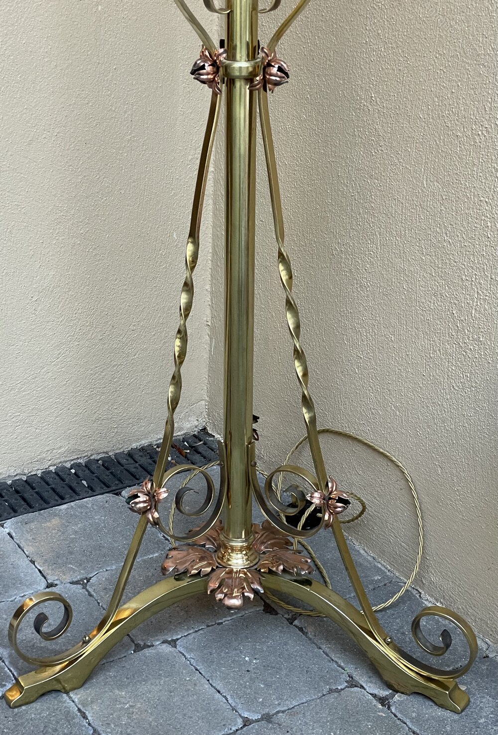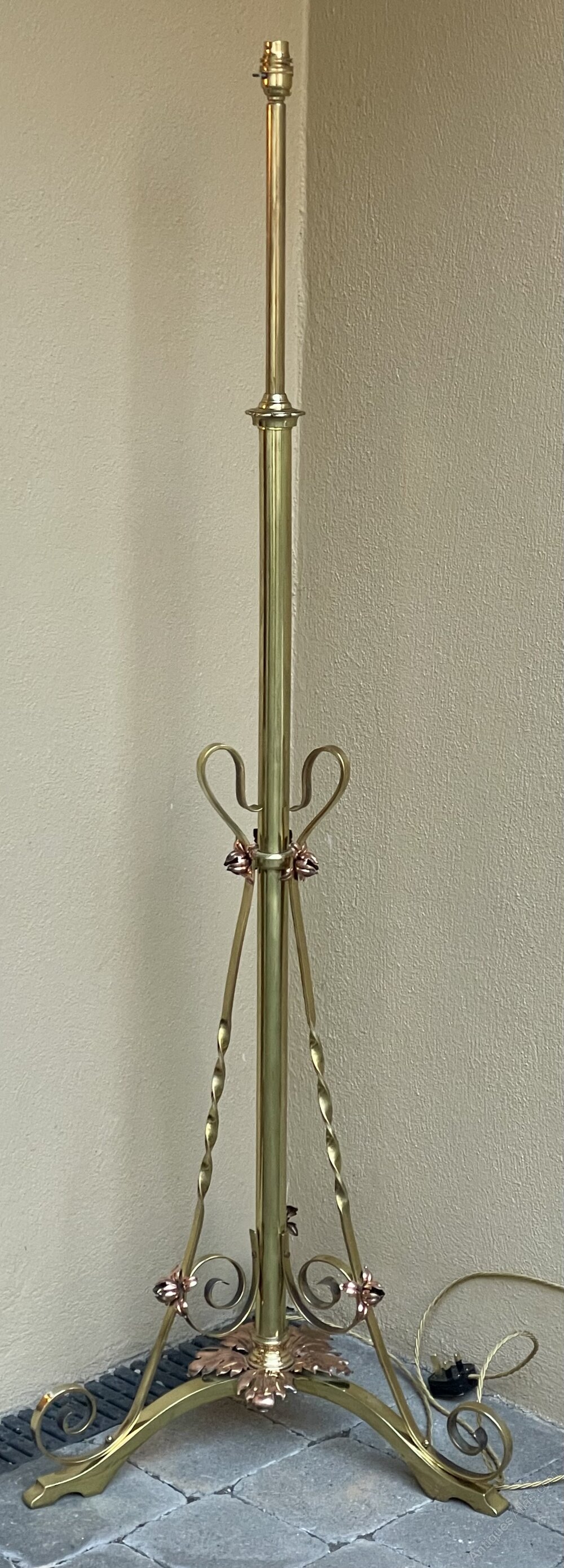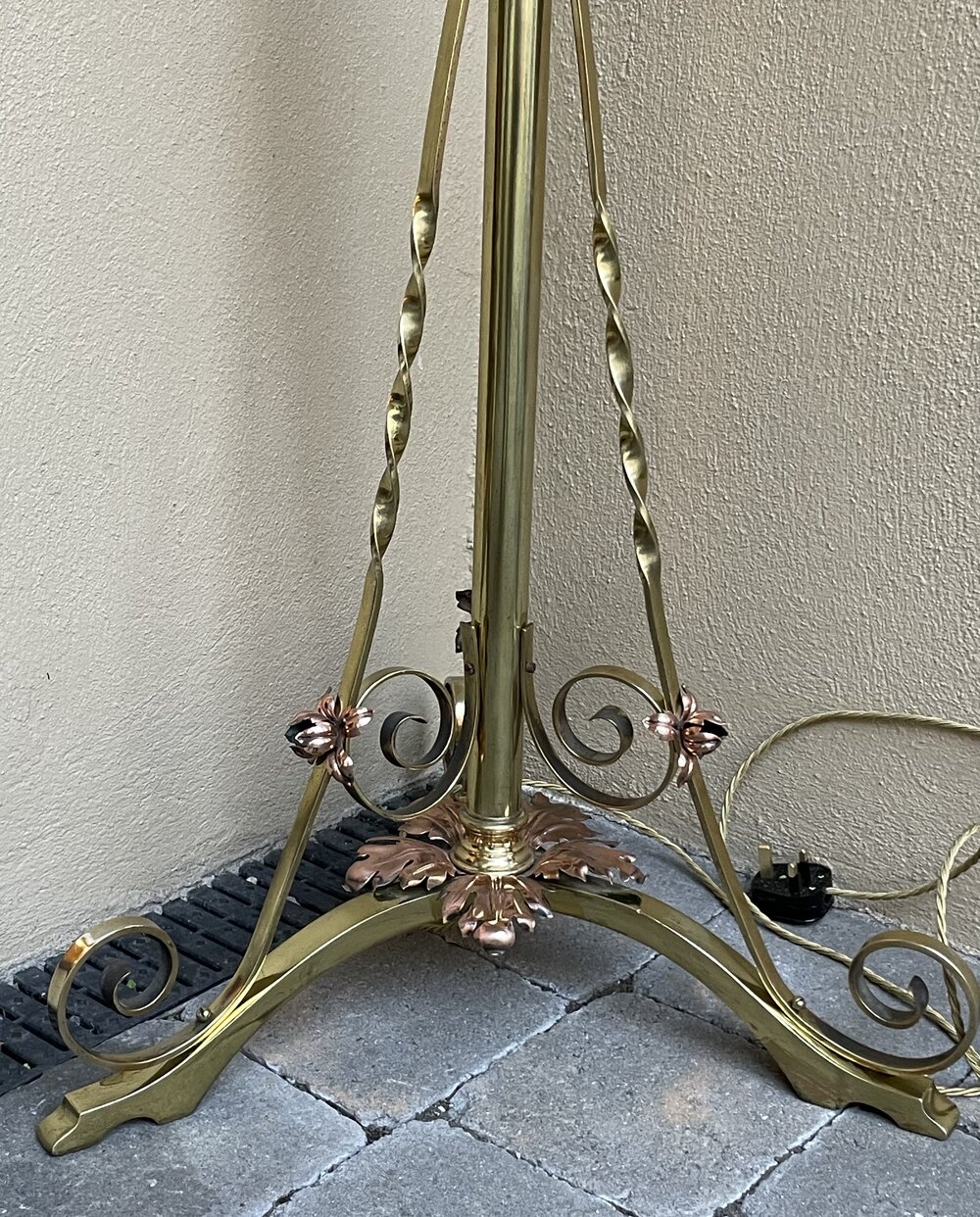 A beautiful and most elegant Art Nouveau brass and copper standard lamp, adjustable in height, and supported on three twisted and scrolled brackets adorned with copper leaves. Fully rewired in period style braided flex and PAT safety tested.