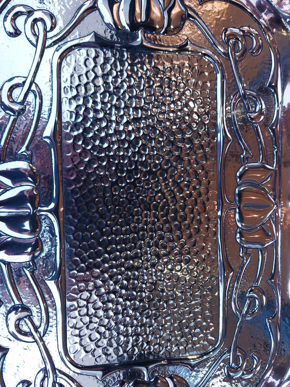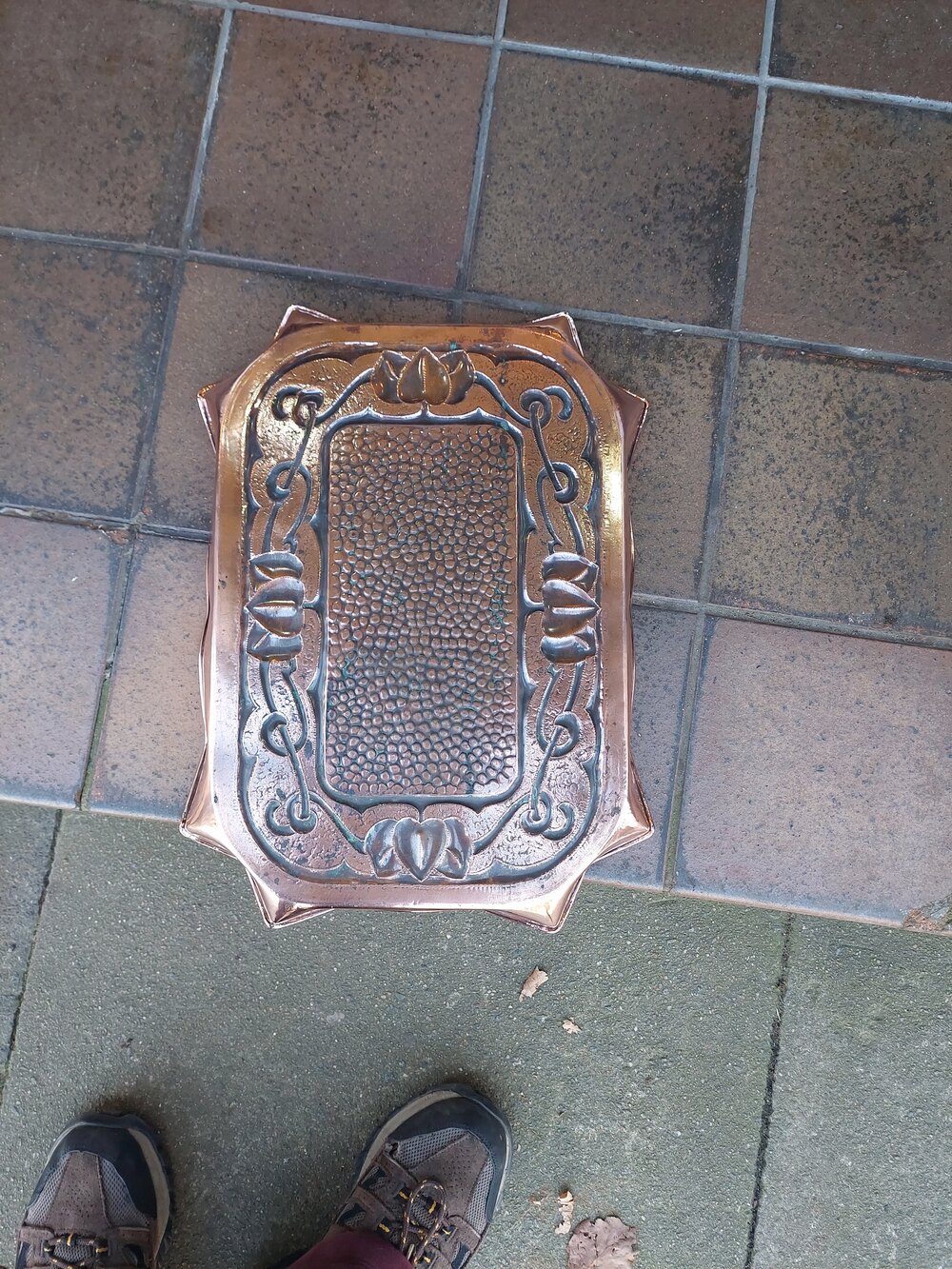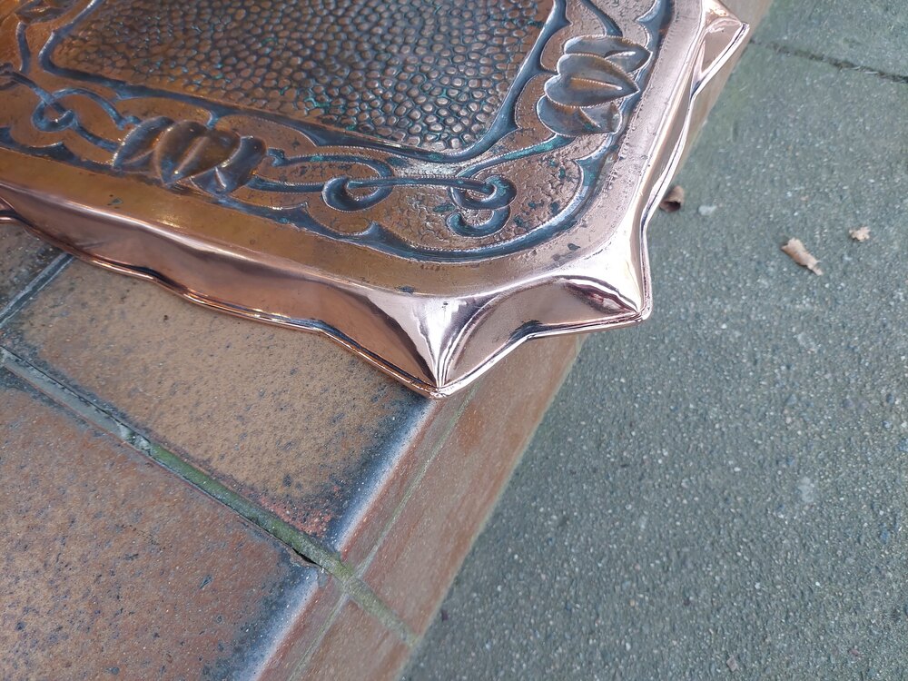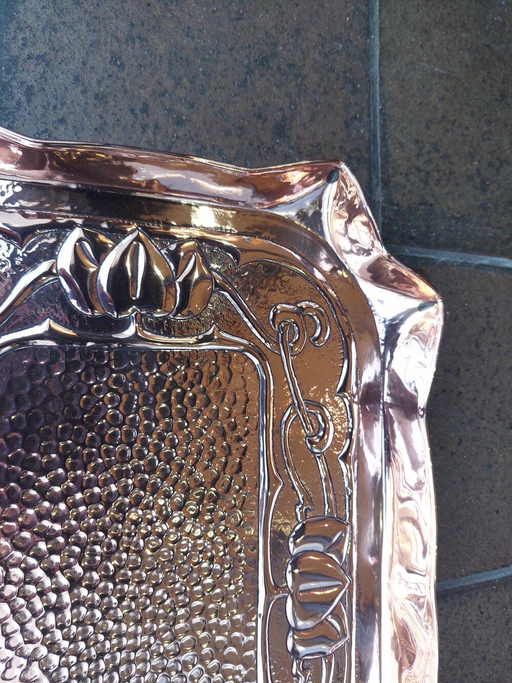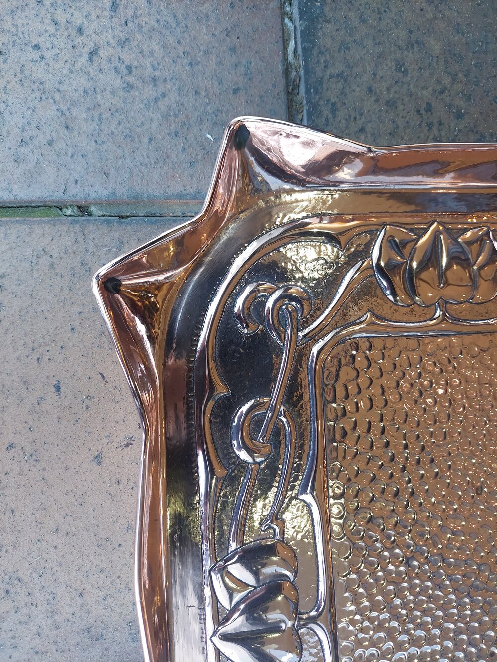 Art Nouveau copper tray with shaped edge the interior decorated with hearts and scrolls - 17"w x 13"d x 1.5"h