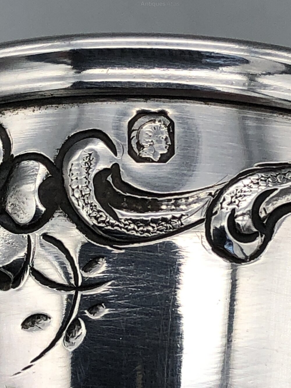 The hallmark, just below the rim, shows the Minerva 1 stamp to indicate that it is French 950/1000 grade silver. As per above there is a makers' mark in a lozenge but we have not been able to identify this.