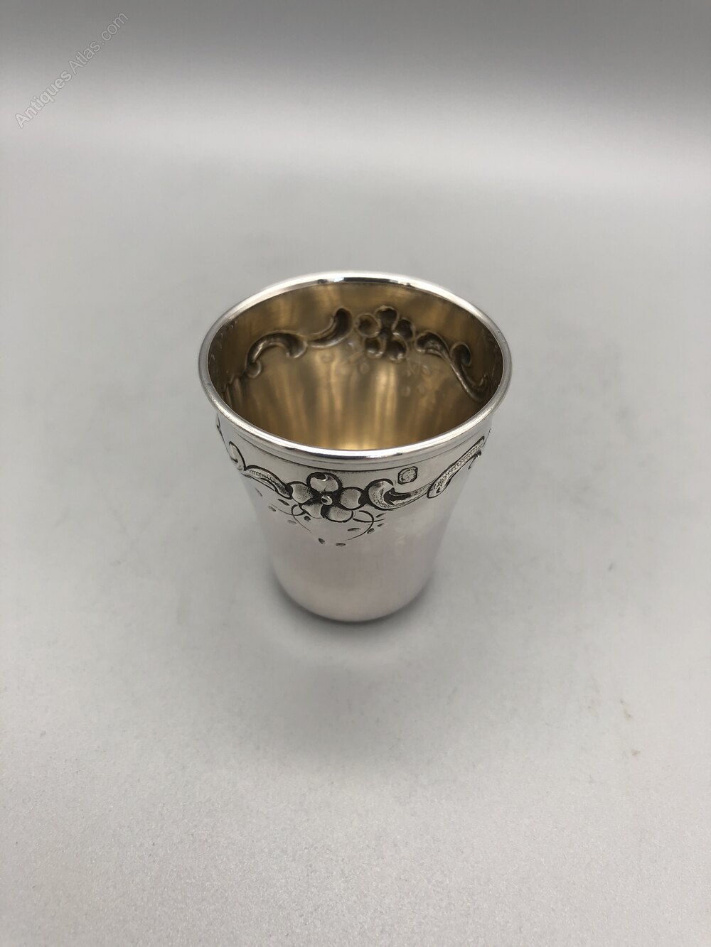 Here we have a lovely Art Nouveau French 950 Silver Tot Cup. The small beaker is a tapered cylinder with an embossed flowers and foliage design just below the rim. The interior of the cup is gilded.