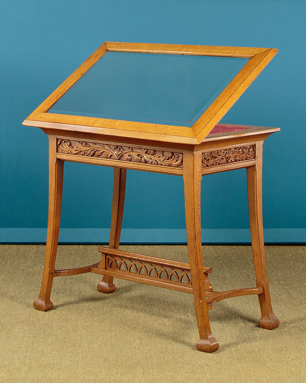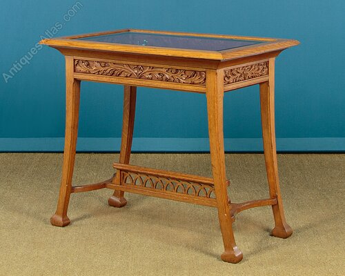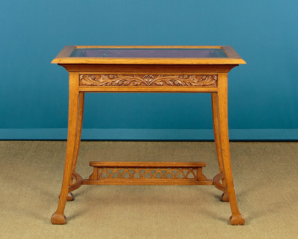 Unusual Art Nouveau oak display top table c.1910. Bijouterie display top (internal height 3") with a hinged lid with a bevelled glass panel and lined inside with a red silk damask. Flared top with a moulded edge over a carved frieze of leaves and seed heads to all four sides. Raised on curving legs with chamfered corners and bulbous feet. Joined with curved side stretchers and a centre stretcher with a pierced gallery of repeated arches. Excellent condition, cleaned and waxed in our workshops.