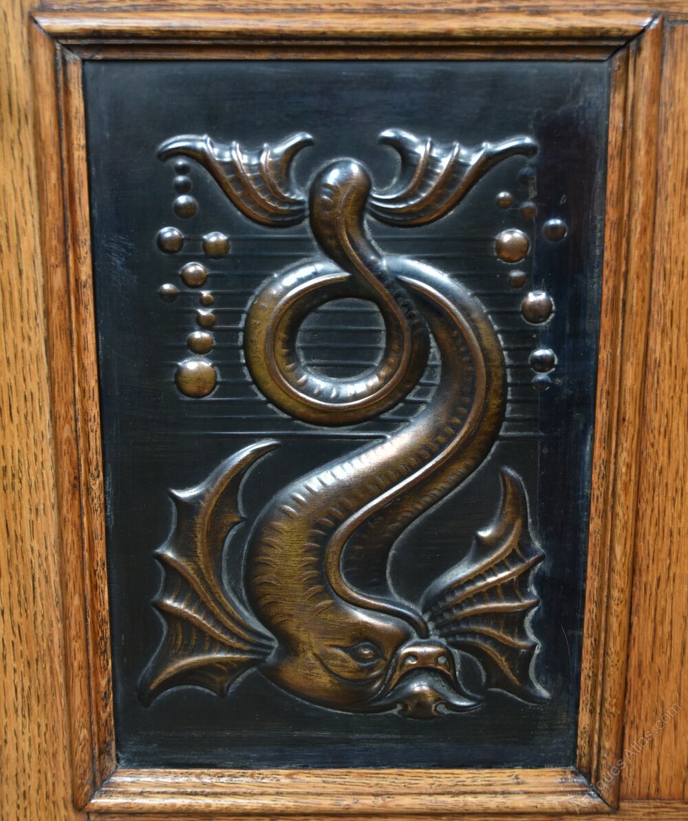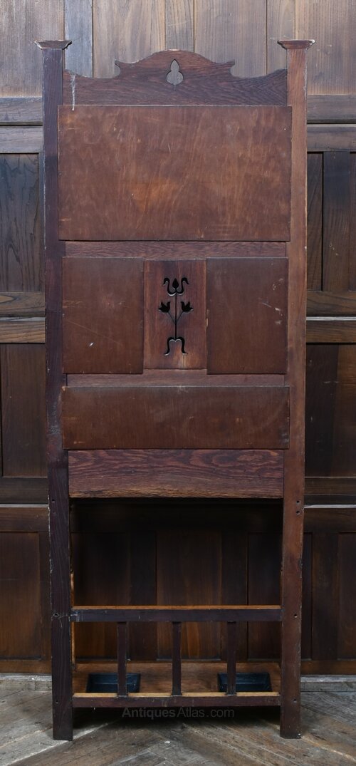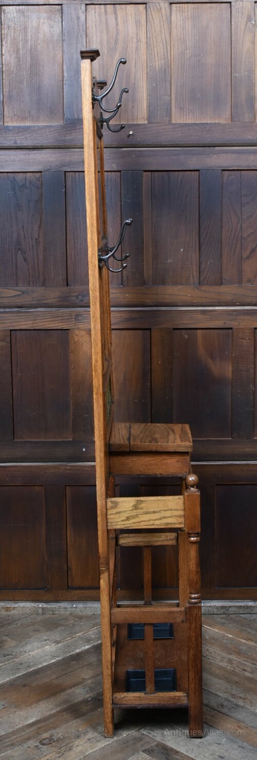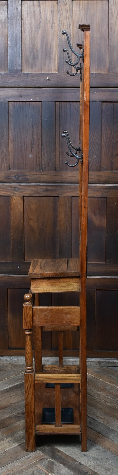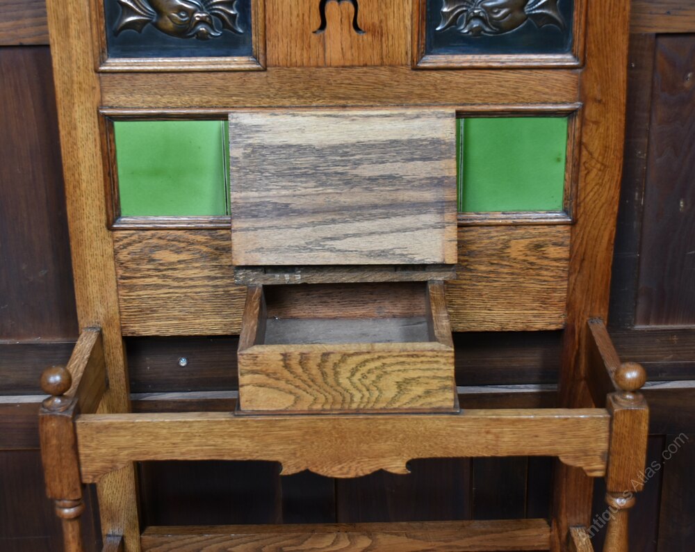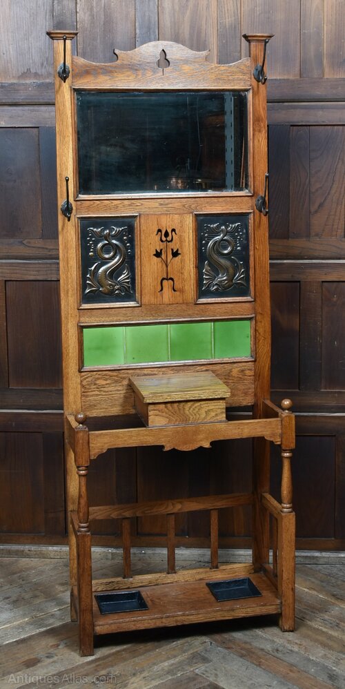 An impressive oak Art Nouveau hall stand in excellent antique condition. The upper section is fitted with a rectangular mirror, flanked by four metal coat hooks, and set above two embossed panels with a central carved floral motif. A row of green ceramic tiles provides a lively decorative accent, while the lower section incorporates a small compartment and umbrella rack with twin drip trays. Turned supports and finials complete the design, balancing function with artistry. The richly coloured oak, with its beautifully figured grain and mellow patina, reflects decades of careful use and polishing. With only minor marks consistent with age, this piece combines charm and practicality, its tall, architectural form making it a commanding focal point in any entrance hall, restaurant, or waiting room.