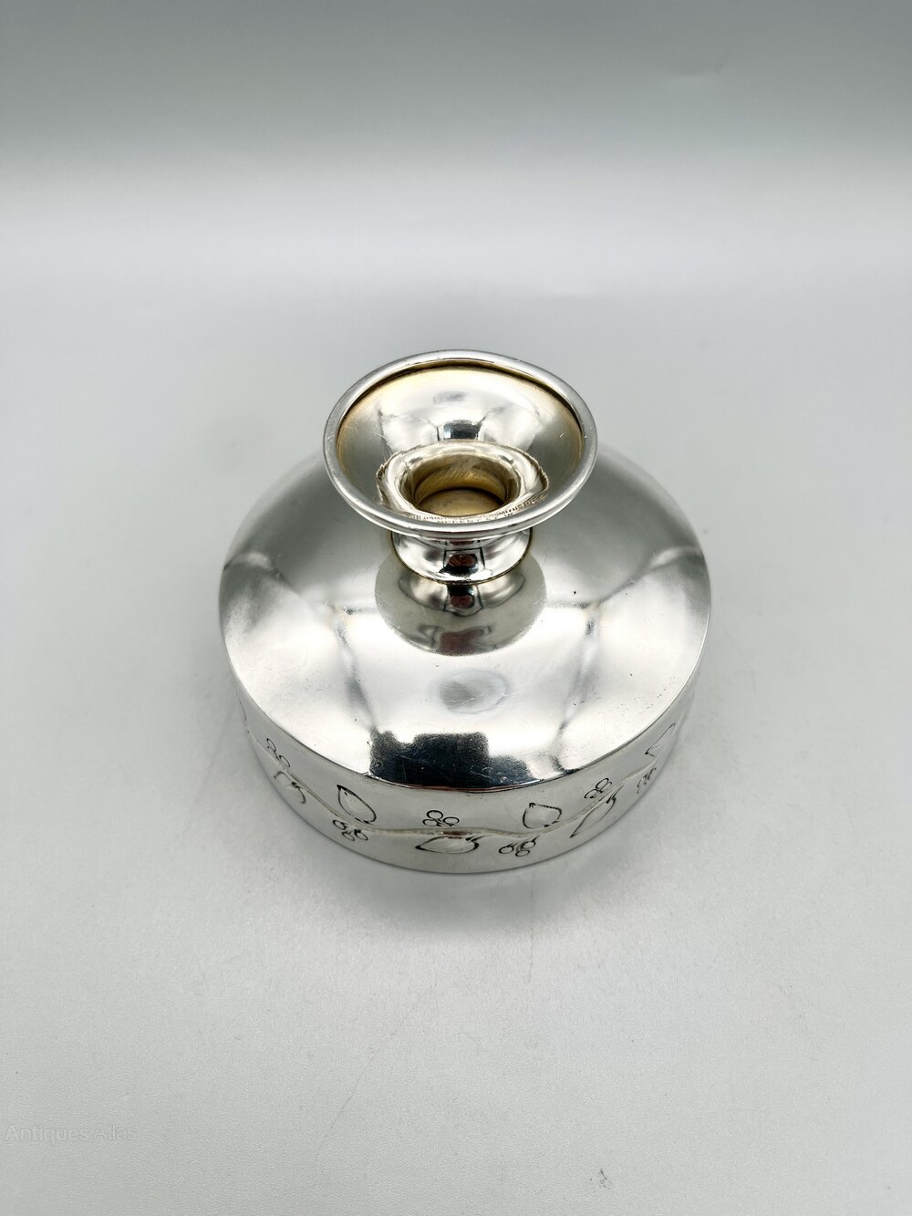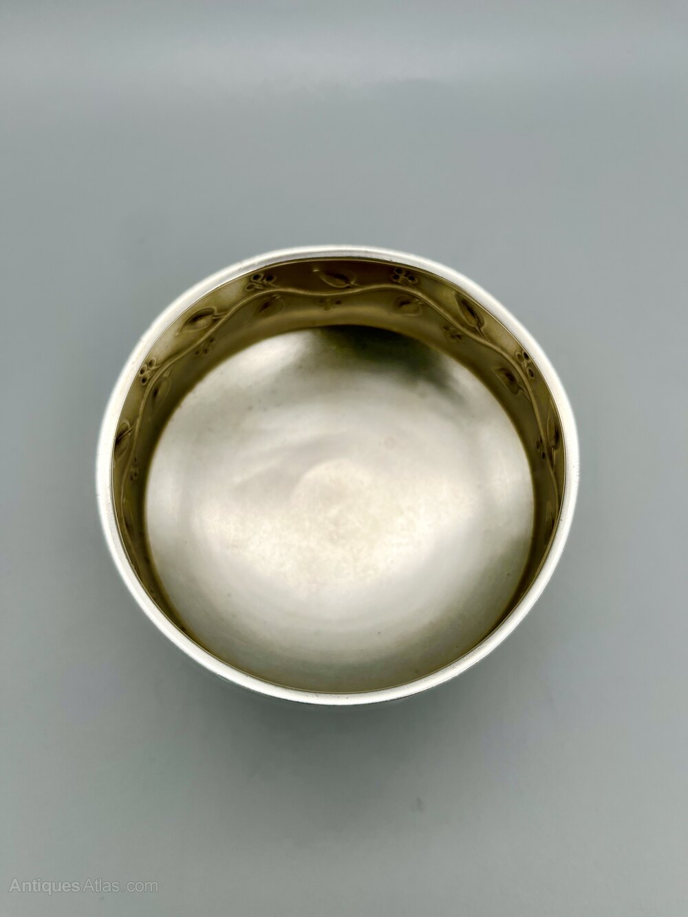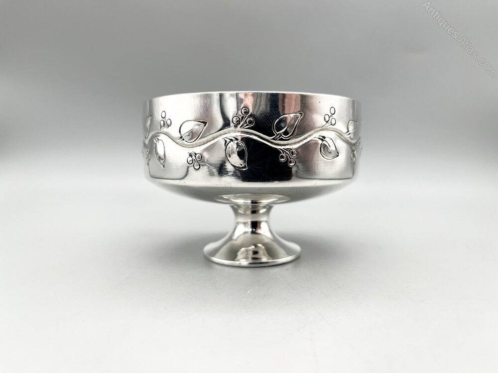 Here we have an elegant Art Nouveau Sterling Silver Bowl with a Gilt Interior. The circular bowl stands on a pedestal stem and the outside of the body is decorated with a continuous line of leaves and berries on a sinuous stem. There are no initials or personalisation of any kind.
