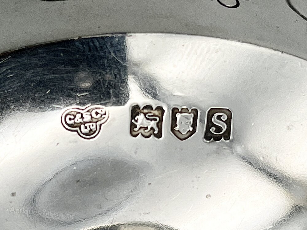 The hallmarks, on the outside of the floor of the bowl, are well struck and clesr to read. They show the lion passant for Sterling Silver, the leopard's head assay mark for London, the date letter s for 1913 and the distinctive G & S Co Ltd makers' mark for The Goldsmiths & Silversmiths Company Ltd.