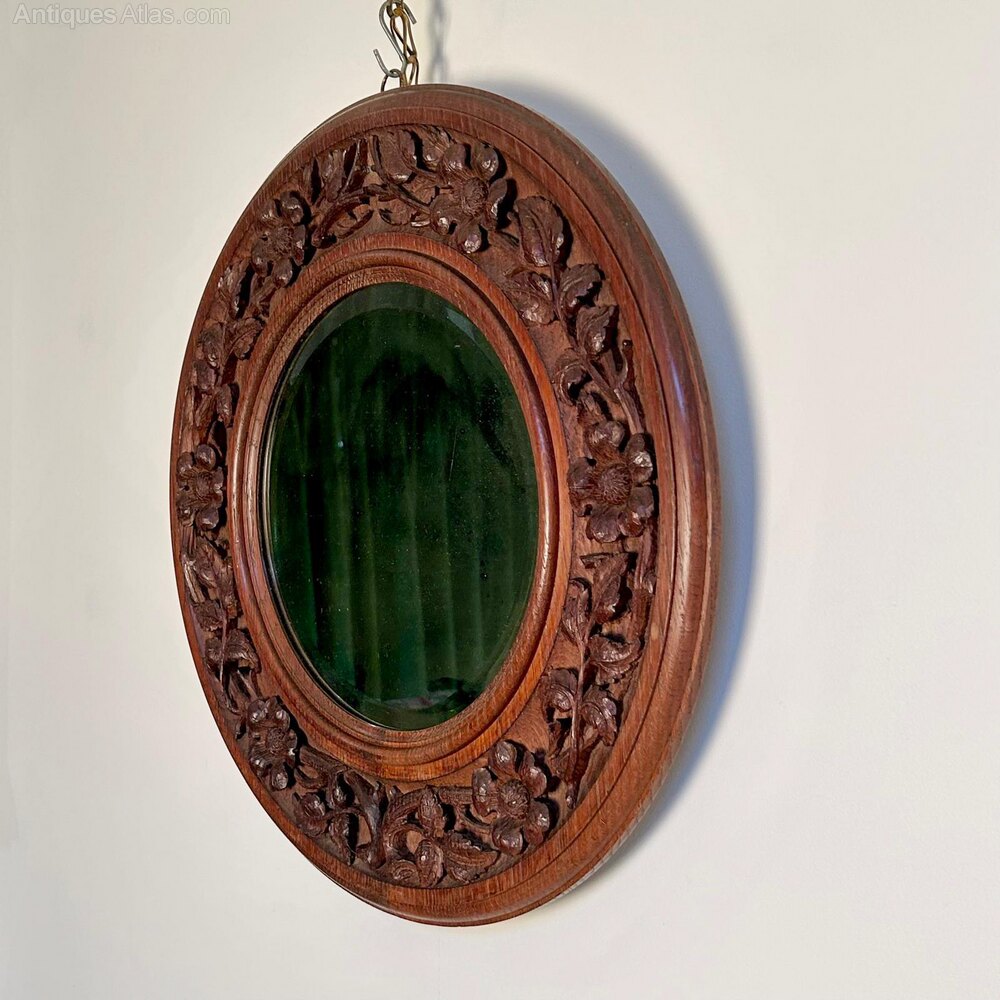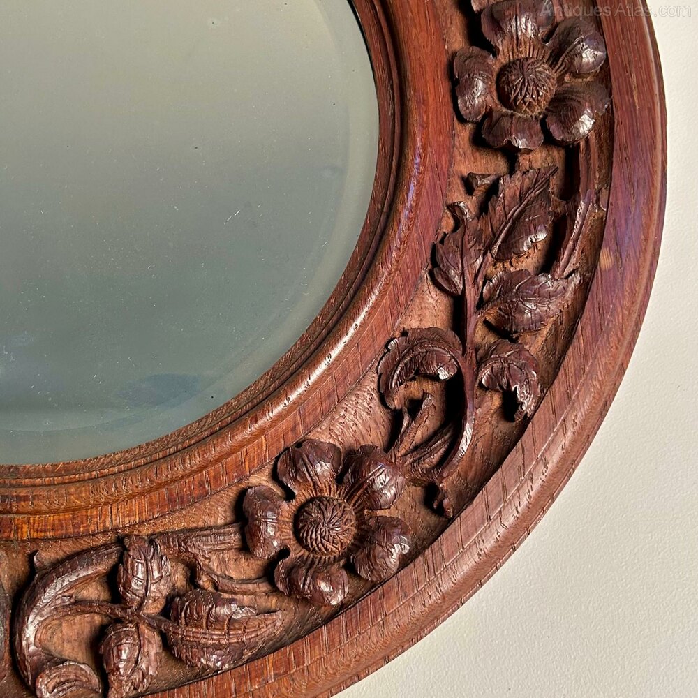 A small Arts & Crafts circular mirror attributed to Arthur W Simpson. The moulded oak surround decorated with trailing flowing foliage, all in beautifully hand carved releif. Retaining the original bevelled edge mirror plate of which show age with a good clear reflection. English, Circa 1910.