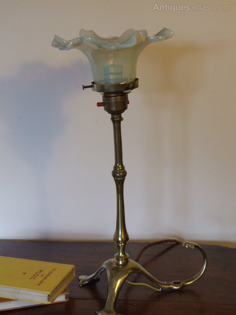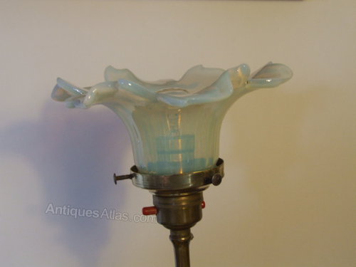 Brass Arts & Crafts lamp with heavy opalescent shade. Lampbase and shade dating from around 1900. Rewired with new braided flex and PAT tested. Height 14 1/2 inches (37cm)