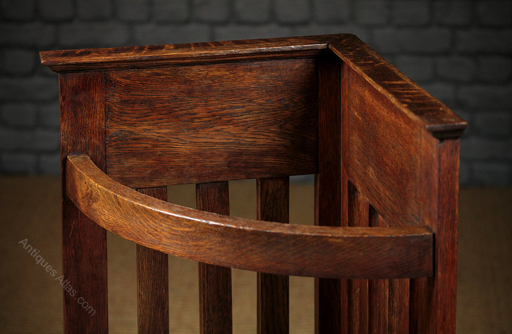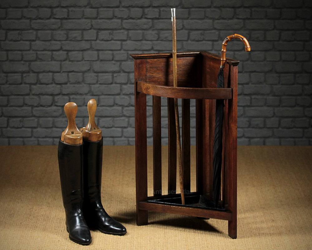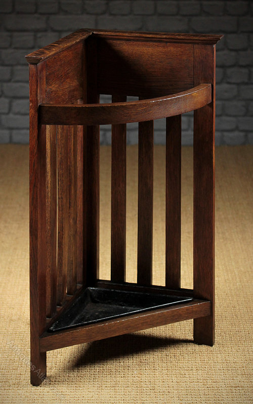 Unusual Edwardian era Arts & Crafts style corner stick or umbrella stand. Simple design in solid oak throughout, of triangular section with a bowed stay rail at the top. Excellent condition, cleaned and polished in our workshops, with the original removable drip tray.