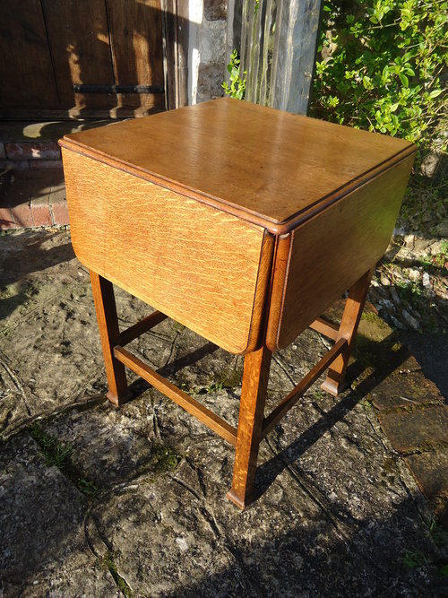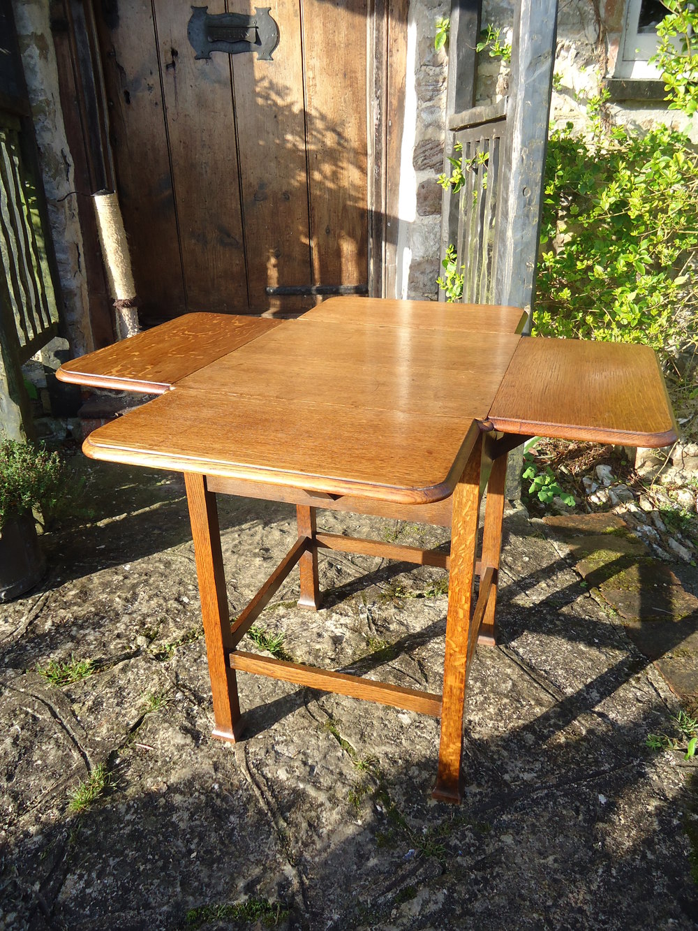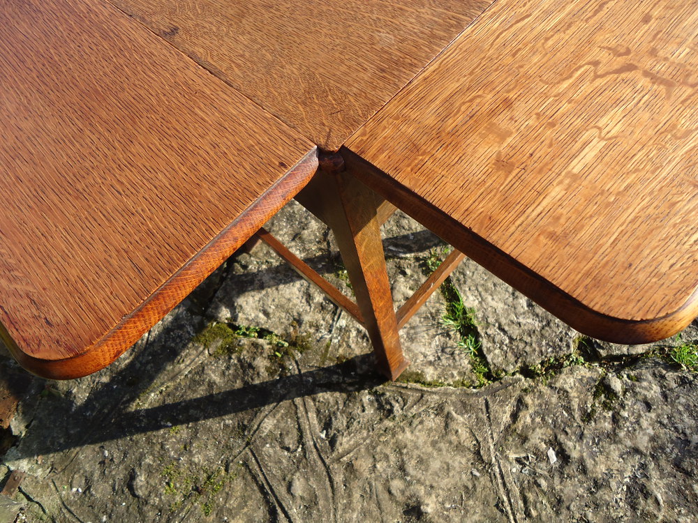 A very useful Arts & Crafts oak tea table. Nice and compact as a lamp or side table and opens to serve as a tea table or card table.