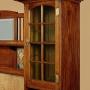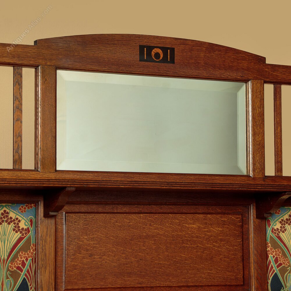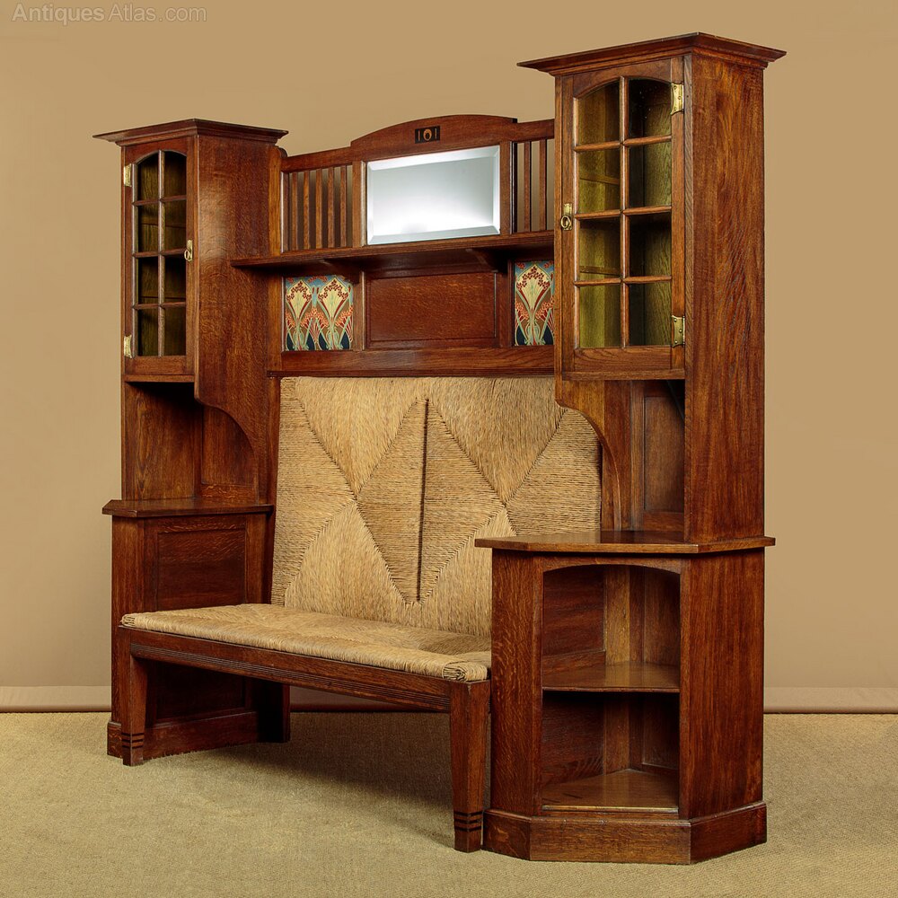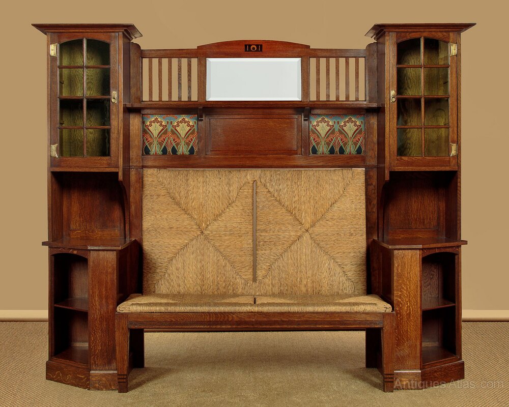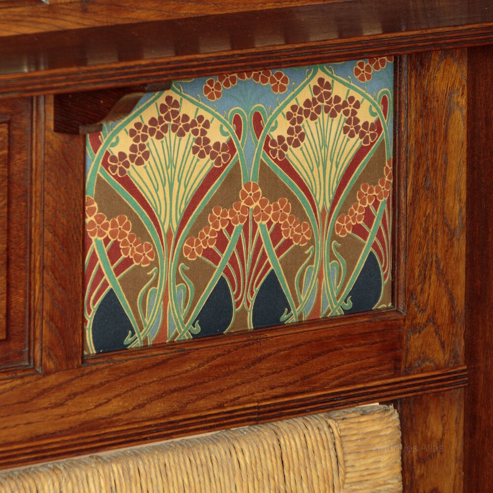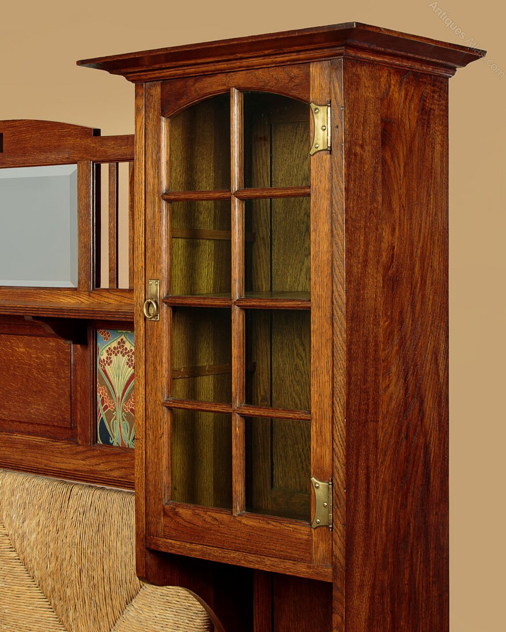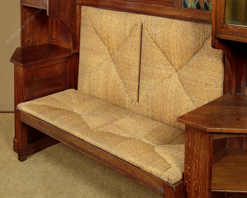 Fabulous Arts & Crafts style hall oak bench and side cabinets c.1910. 54" wide settle with woven rush panels to the backrest and seat. Bevelled mirror and display shelf (depth 6") above the seat. Flanked on both sides with glazed cabinets, featuring hand blown green glass panels to the doors and fitted with a single shelf inside (depth 10"). Over deeper side tables with canted corners, and open shelves below. Slim overhanding cornice to the side cabinets, original brass handles and catches. Note the inlaid detail to the central pediment above the mirror and the the two small Liberty & Co. fabric upholstered panels below the shelf. Reeded front edge below the seat and inlaid detail to the legs. Excellent colour and condition, cleaned and waxed in our workshops.