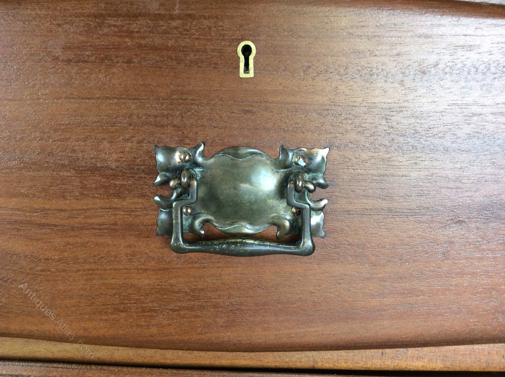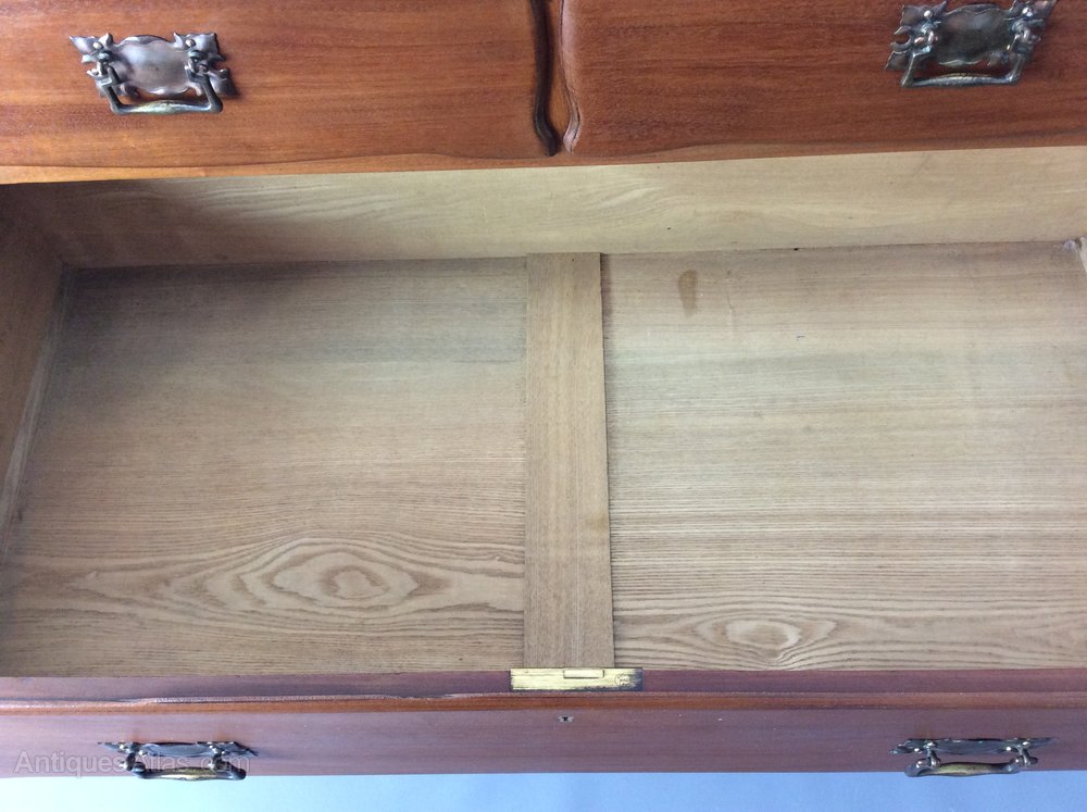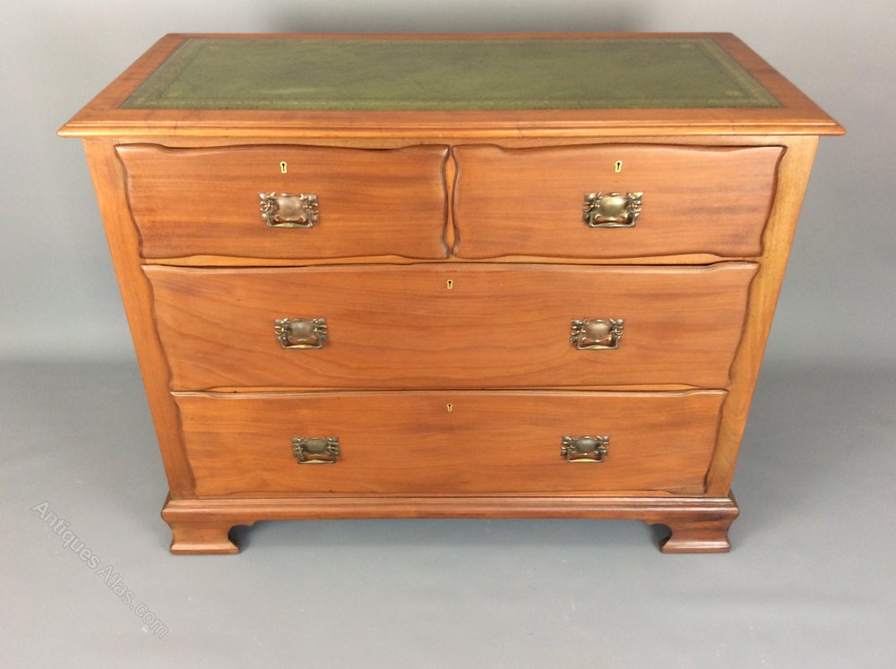 Unusual Arts & Crafts mahogany chest of drawers having a leather top over two short drawers and two long drawers with wavy edges standing on bracket feet. Original Arts & Crafts handles. In good condition. 107cmL x 84cmH x 49cmD