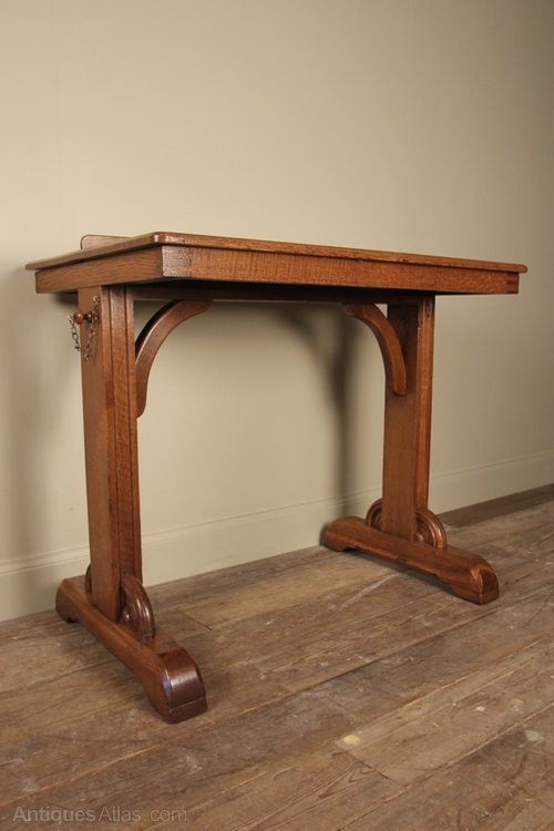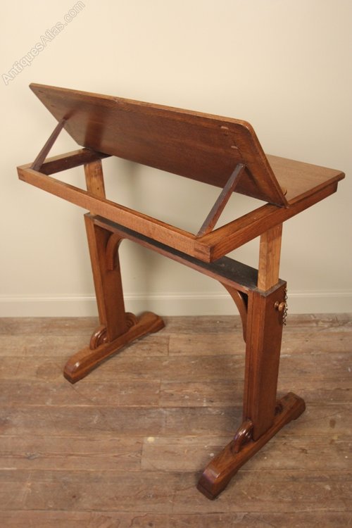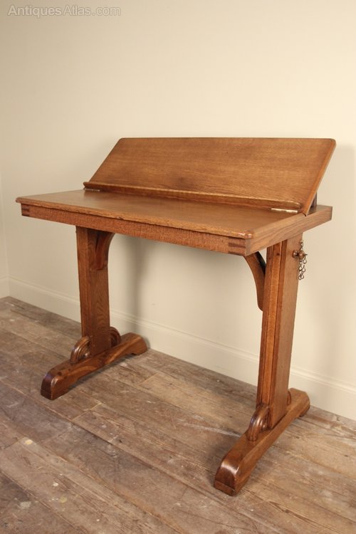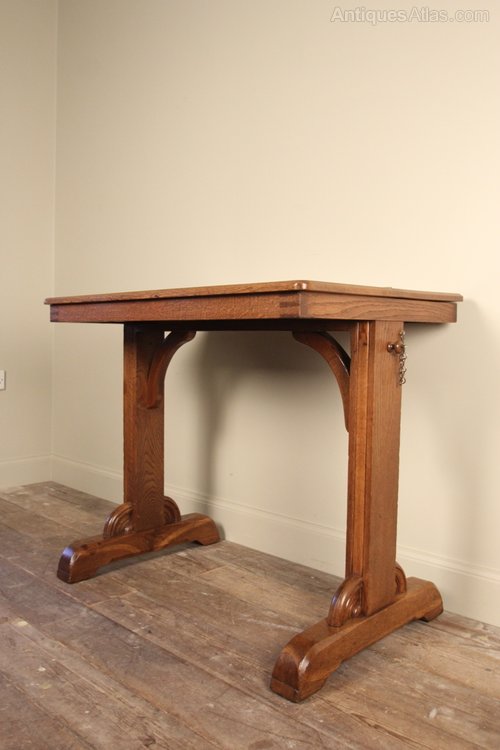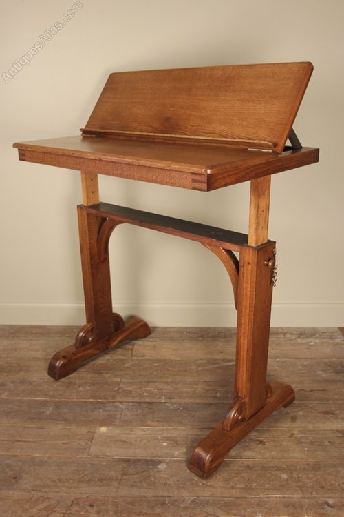 A well proportioned Arts & Crafts Oak Architects Table having an adjustable lifting top and removable rail. The table with good height adjustment and retaining the original fixings. Lovely honey colour to this solid English Oak with moulded top raised on 2 uprights with rounded carved detail.