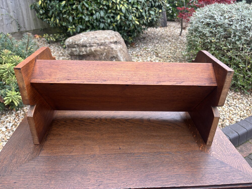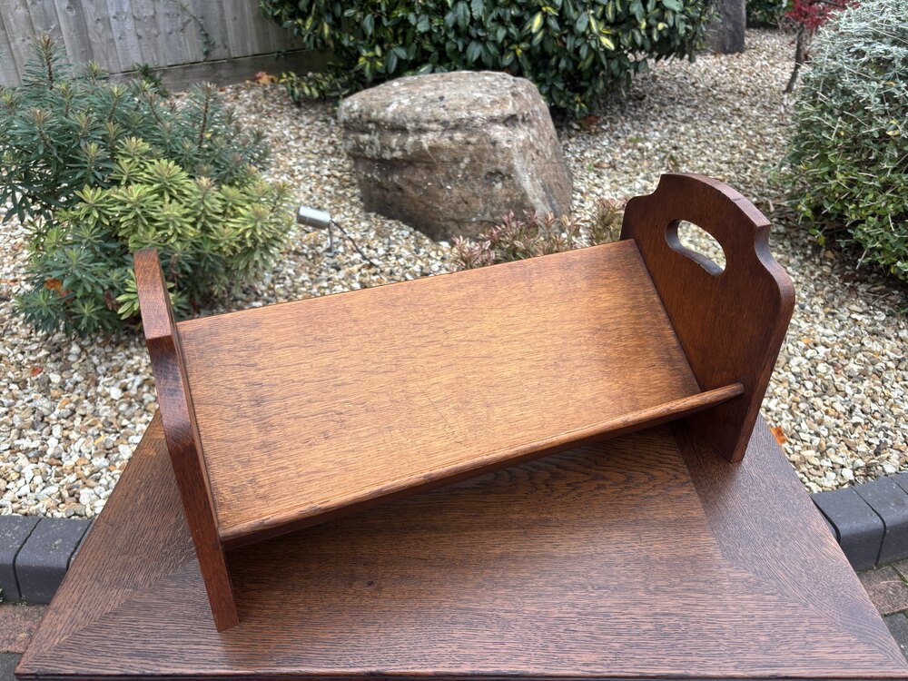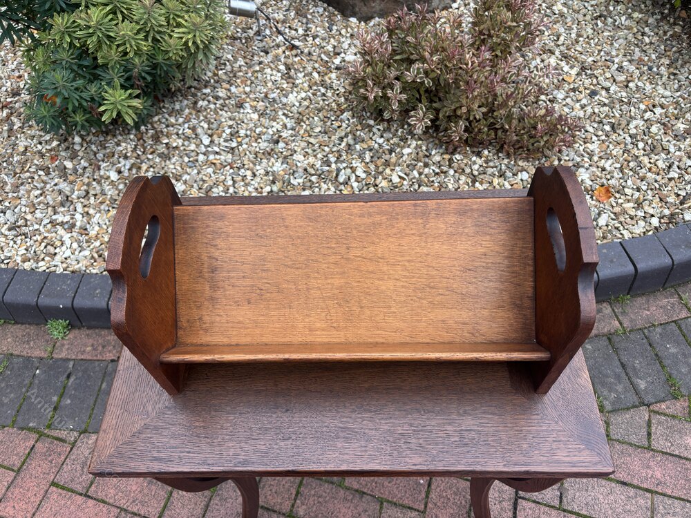 An Arts & Crafts solid oak book trough c1910, having shaped side supports with carrying handles.