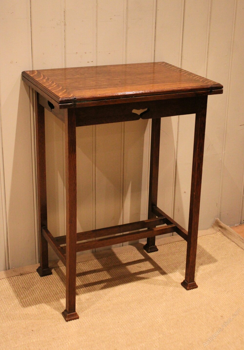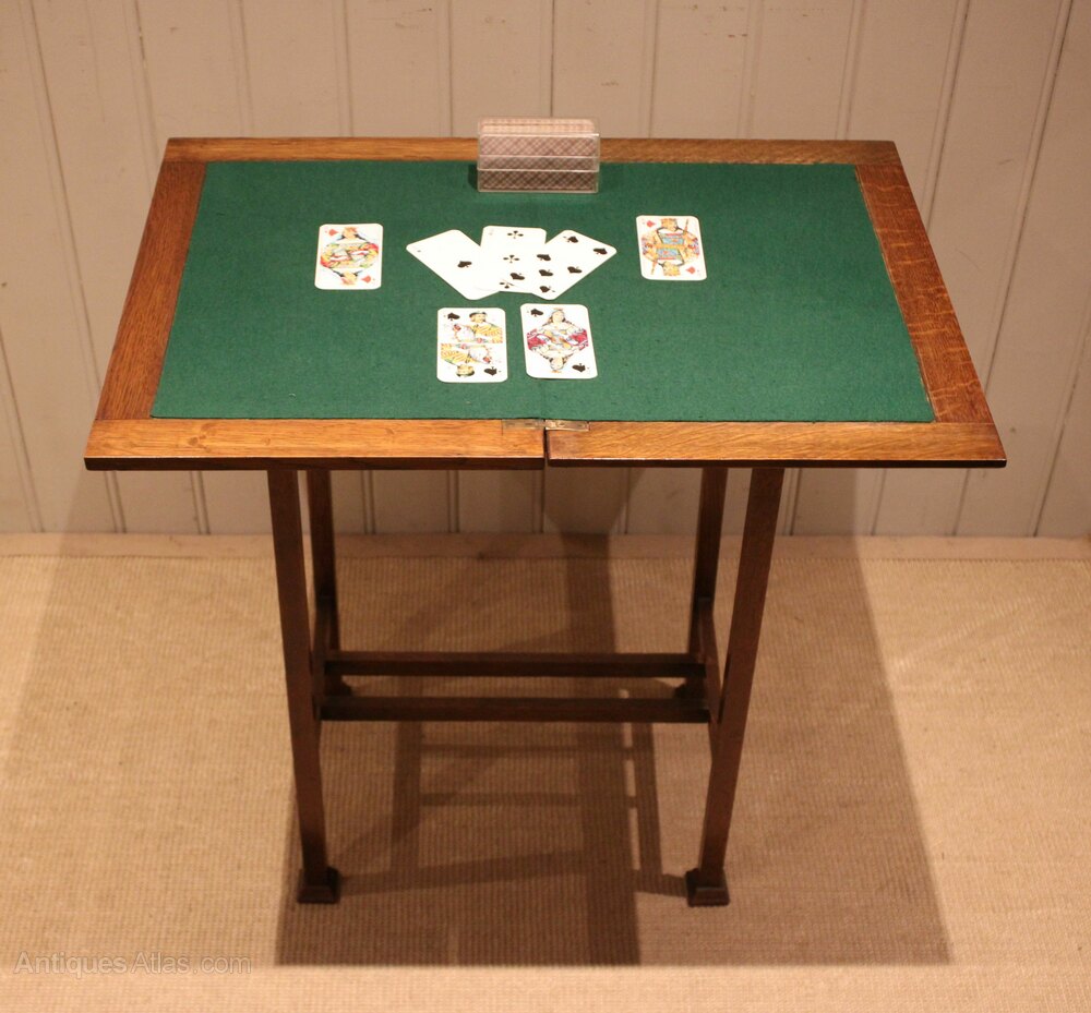 Arts & Crafts oak games / card table having a pierced apron to either side , with a top that opens out into a green baise lined games table , raised on straight tapering legs with shaped feet united by stretchers . When open the top measures 76 cm wide by 53.5 cm deep .