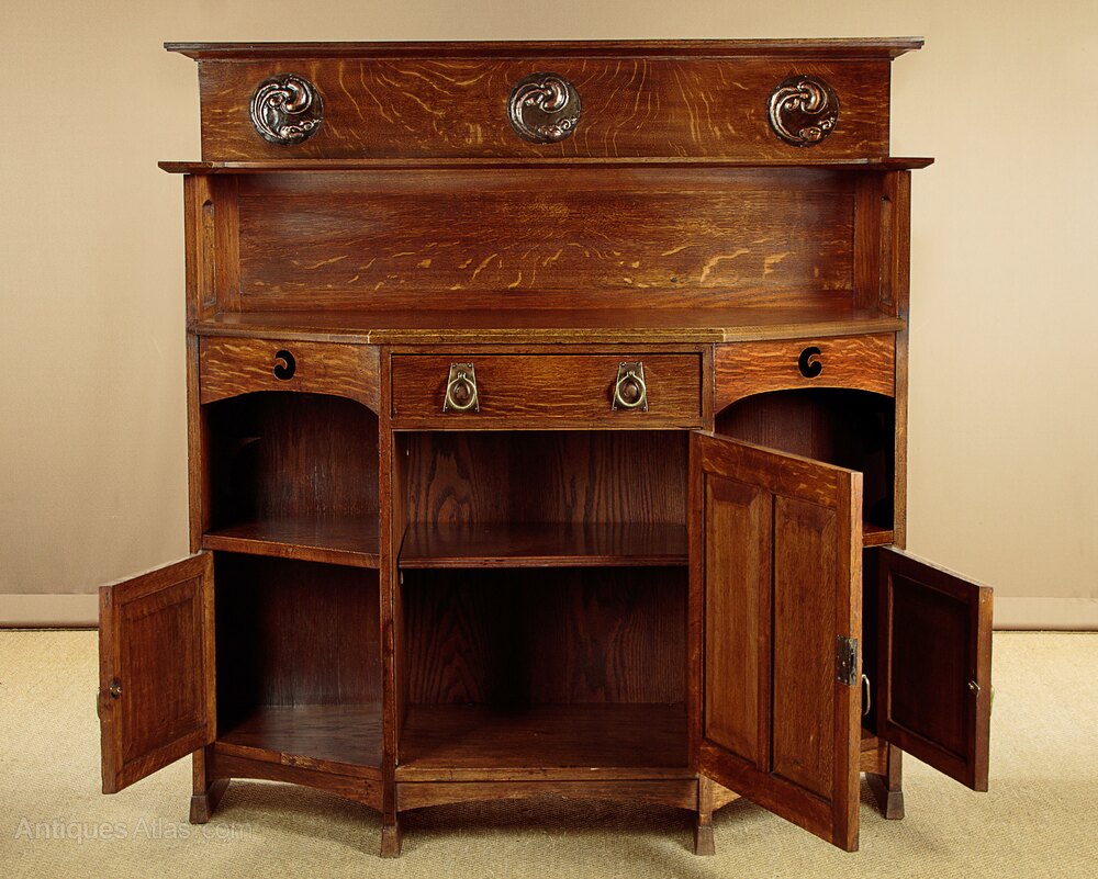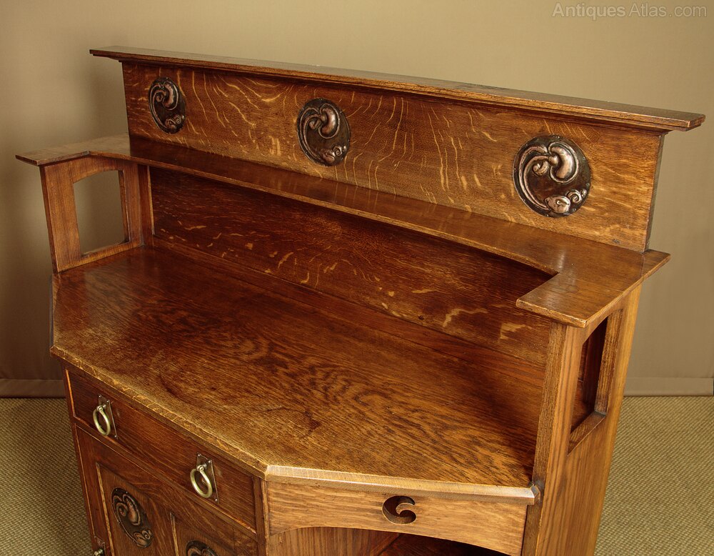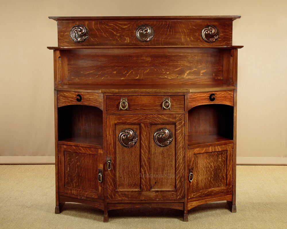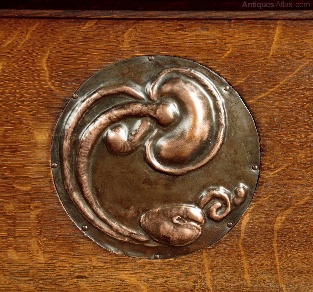 Unusual Arts & Crafts oak dresser or sideboard c.1910. Raised back with three repoussé copper panels featuring a lovely Art Nouveau style motif of organic plant-like forms, over a slim shelf raised on pierced ends. Base with a single drawer and a central cupboard (internal depth 18") flanked with canted sides with open shelves and smaller cupboards below. Superb Arts & Crafts brass handles, note the heart detail at the centre. Two more matching copper panels to the doors and an unusual pierced detail to the curving apron above the shelves. Curved bottom edge with a shaped detail at the centre. Raised on flared sledge feet. Solid oak throughout. Maker's made at the rear for T.M Locke Manufacturers of Colchester. Some minor wear to the top, generally excellent colour and condition, cleaned and waxed in our workshops. Key supplied for the central cupboard.