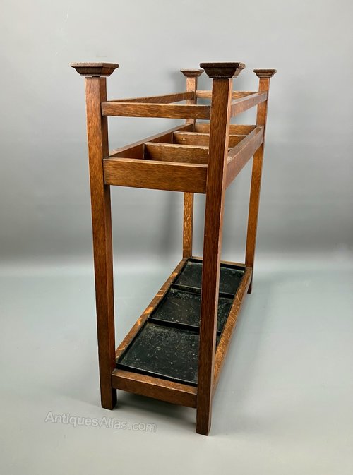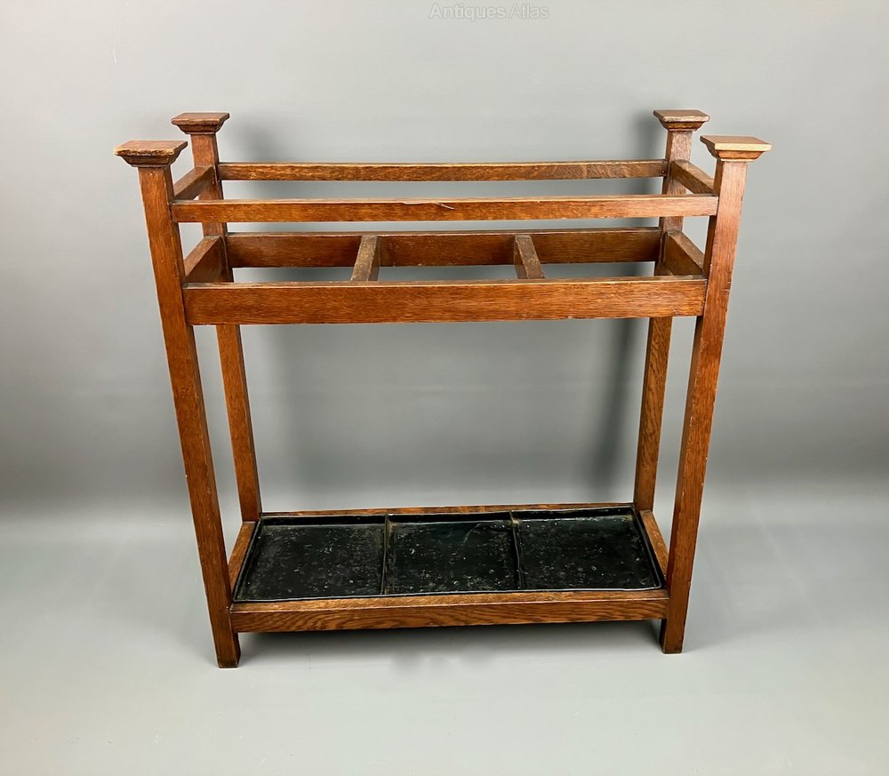 An Arts & Crafts oak stick or umbrella stand, dating to circa 1910, with capped uprights and metal drip tray. A decent design with capacity for plenty of sticks it has been refurbished and has a nice colour. Offered in good condition, commensurate with age, the drip tray has been repainted at some time and shows some wear and, in a couple of places, the original green paint is showing through. But not noticeable in use. It measures 73.5cm tall to the top of the capped uprights, 71cm long and 28cm deep. The price includes delivery within 30 miles of Taunton. Elsewhere £84.00 in England and Wales and £96.00 in Lower Scotland.