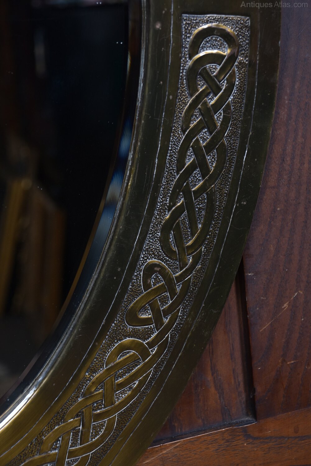 An early 20th‑century Arts & Crafts oval wall mirror, the brass frame decorated with finely executed embossed Celtic knotwork. The interlaced design is crisp and well‑defined, characteristic of the movement’s fascination with handcrafted detail and historic motifs. The mirror plate is set within a deep, gently bevelled surround, and the reverse retains its original hanging cord. A striking decorative piece with strong Arts & Crafts presence.