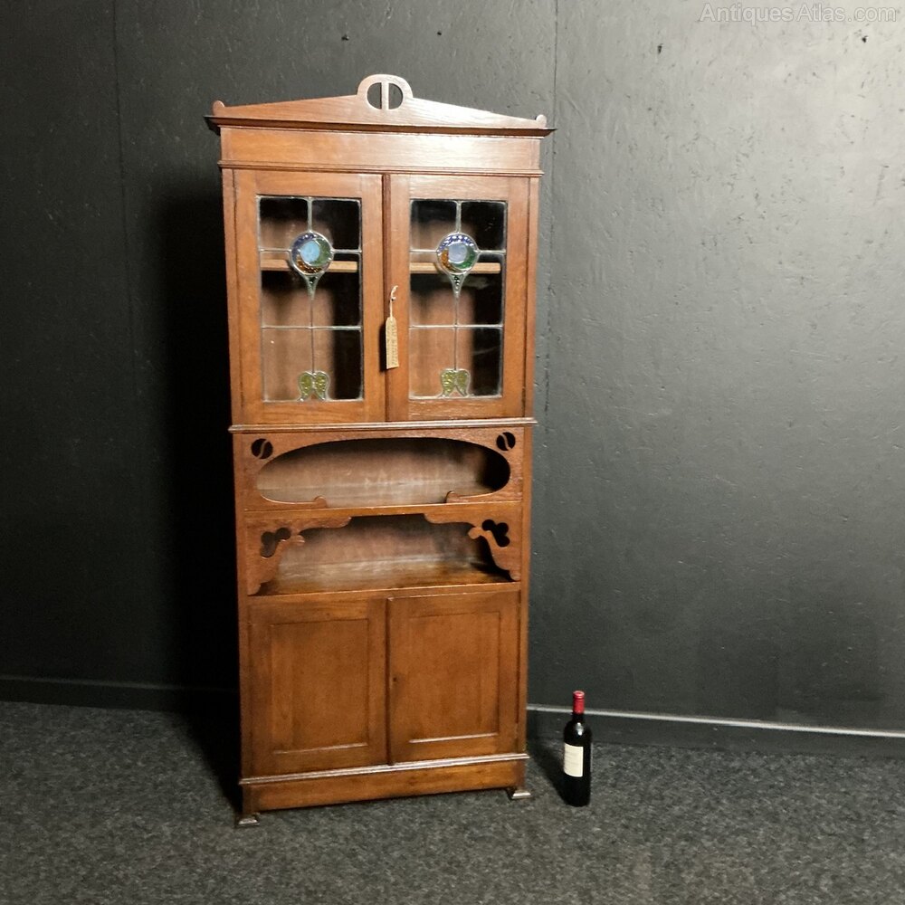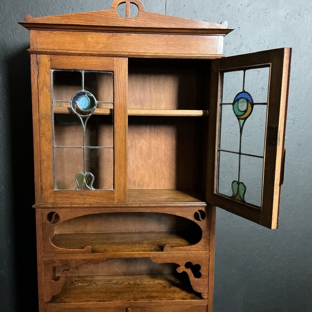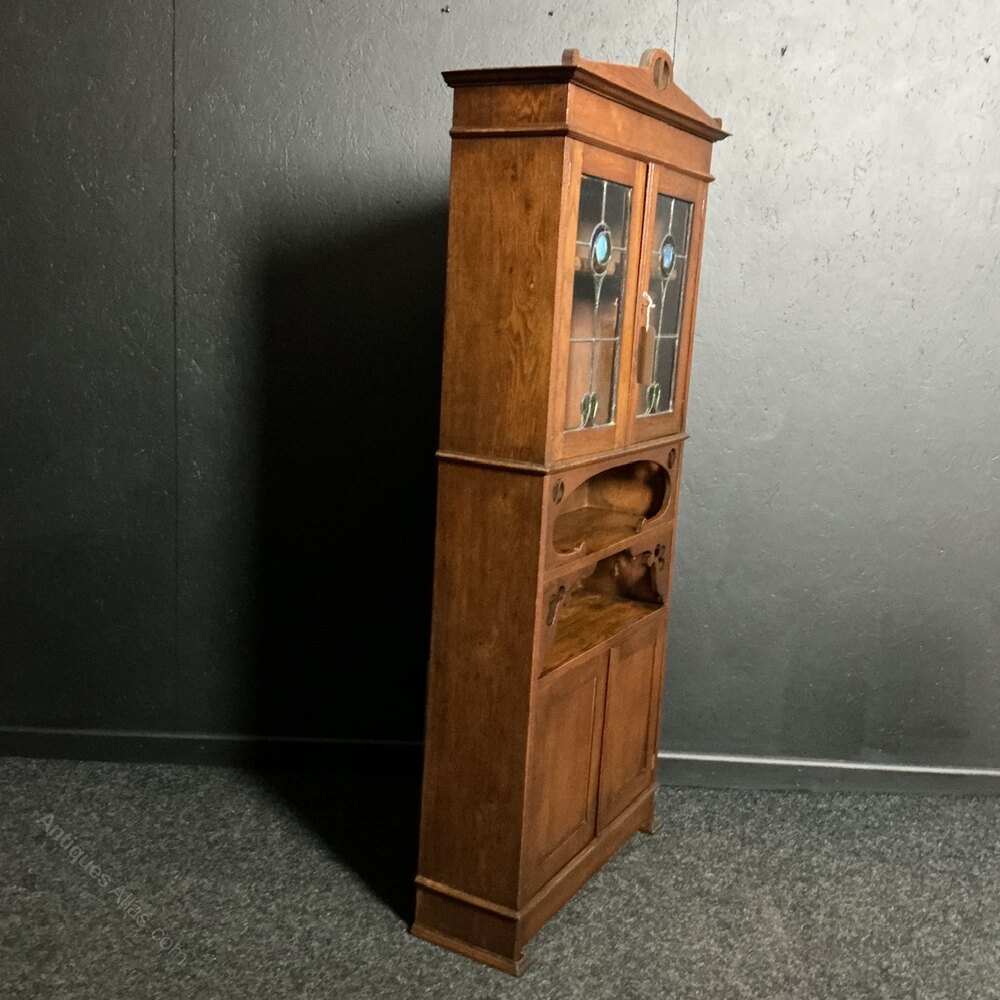 A slender solid Oak bookcase from the Arts and Crafts period. Circa 1890. With a cupboard base and typical recessed shelves to the centre all below a very attractive pair of leaded doors. Al in good condition and ready to use.