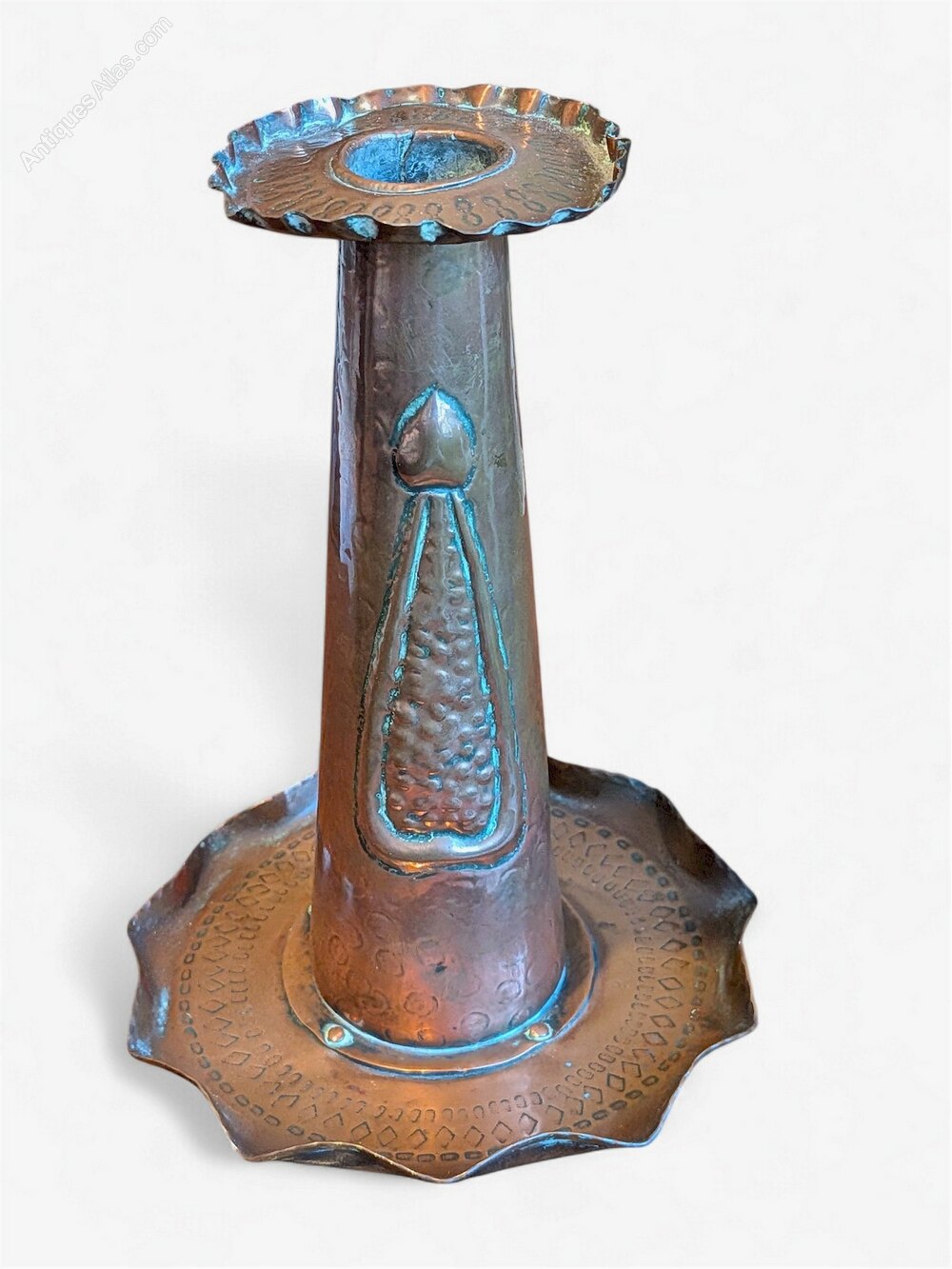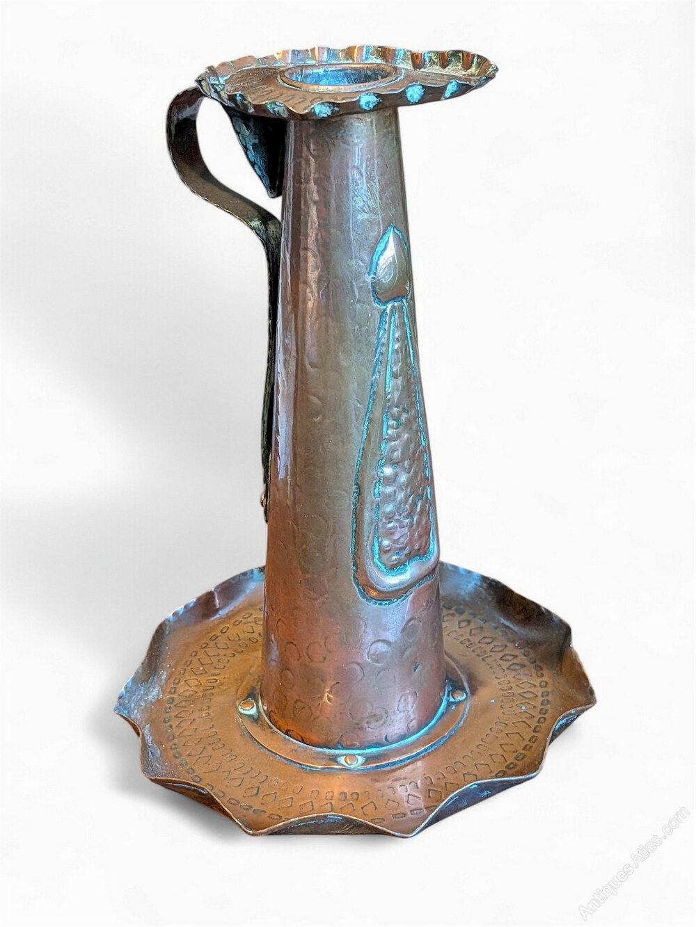 Arts and crafts hand made candlestick in unpolished hammered copper , of riveted construction , attributed to J & F Pool of Hayle . With repoussee decoration and carrying handle , it has a small bang on one side ( see photo ) .