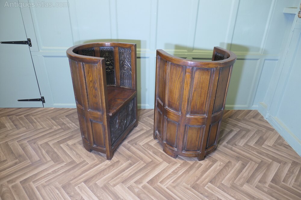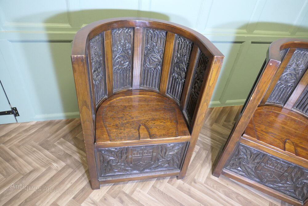 Arts and Crafts Carved Barrel Back Hall or Library Chairs