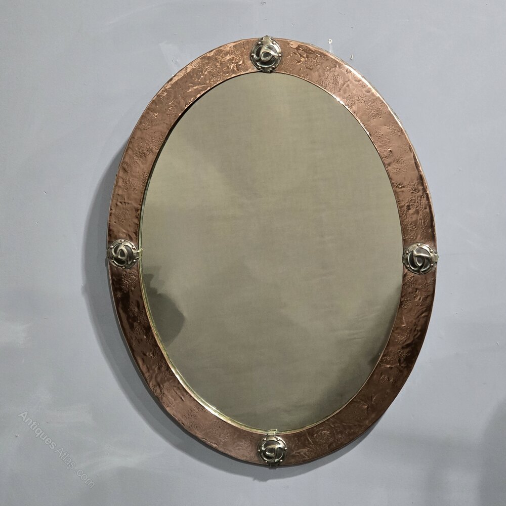 A very good Arts and Crafts oval copper mirror with yin and yang white metal cabochons, original plate mirror, Scottish school, in overall very good condition.