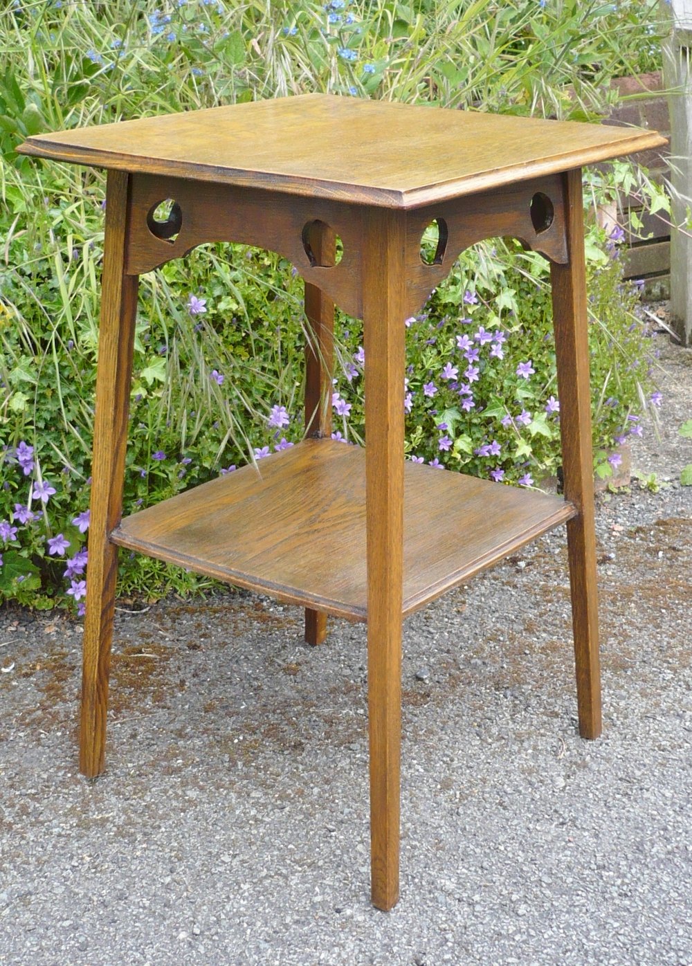 Arts and crafts side table in oak with squashed heart pierced decoration .