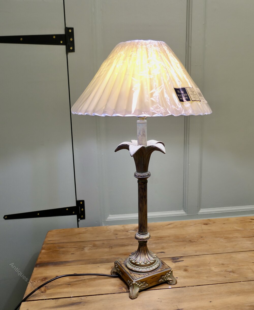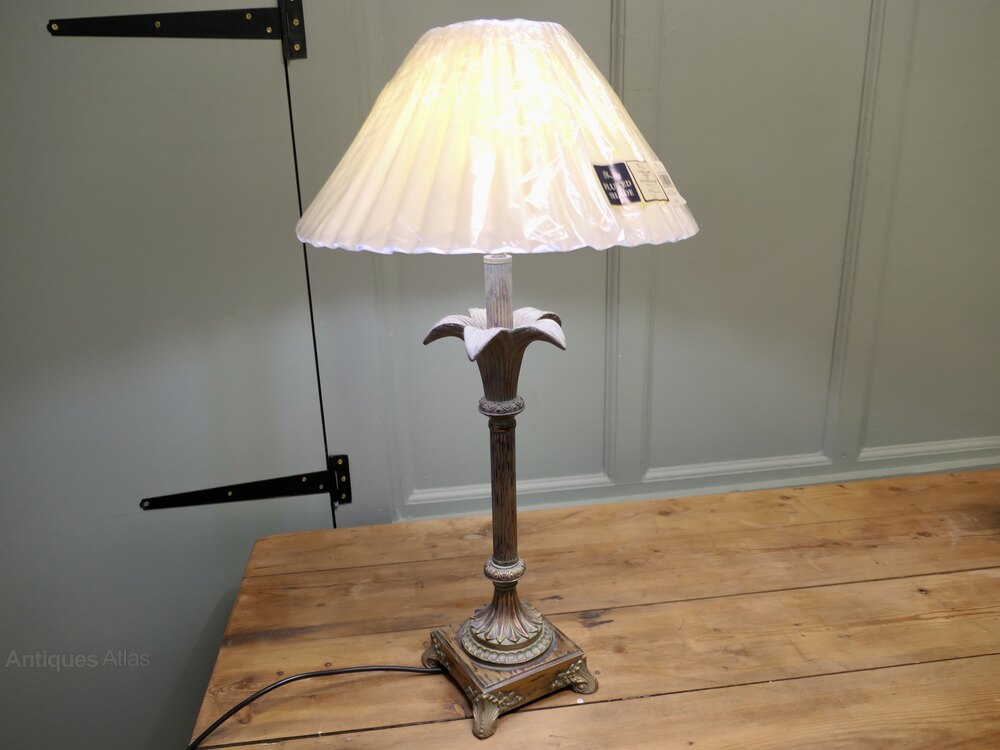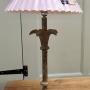 A very pretty piece, the base of the lamp is a figured column sculpted to look like an elaborate brass overlay