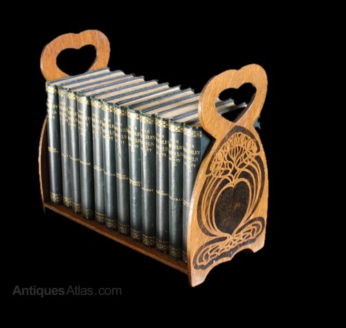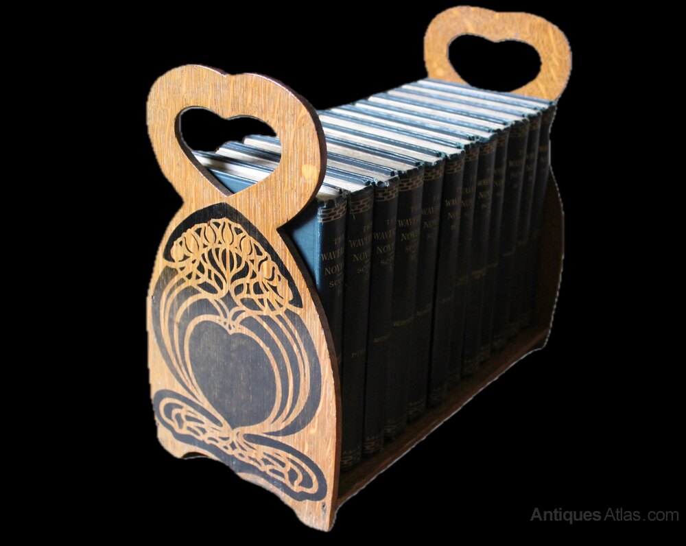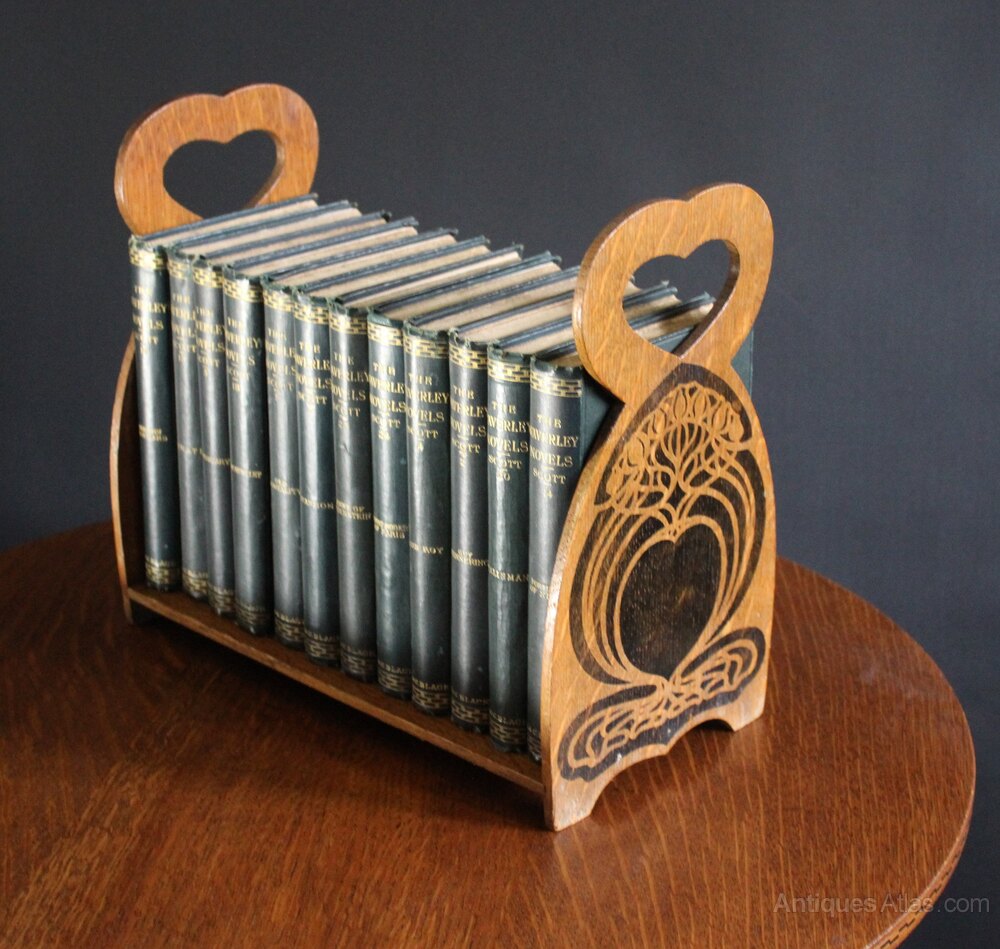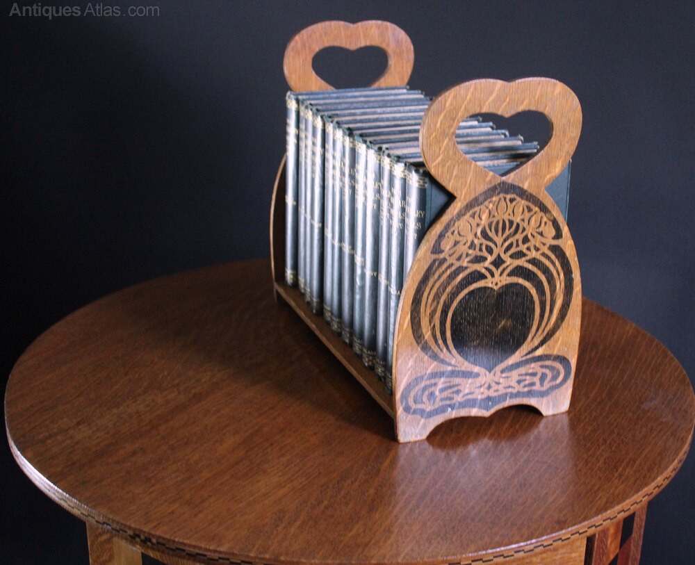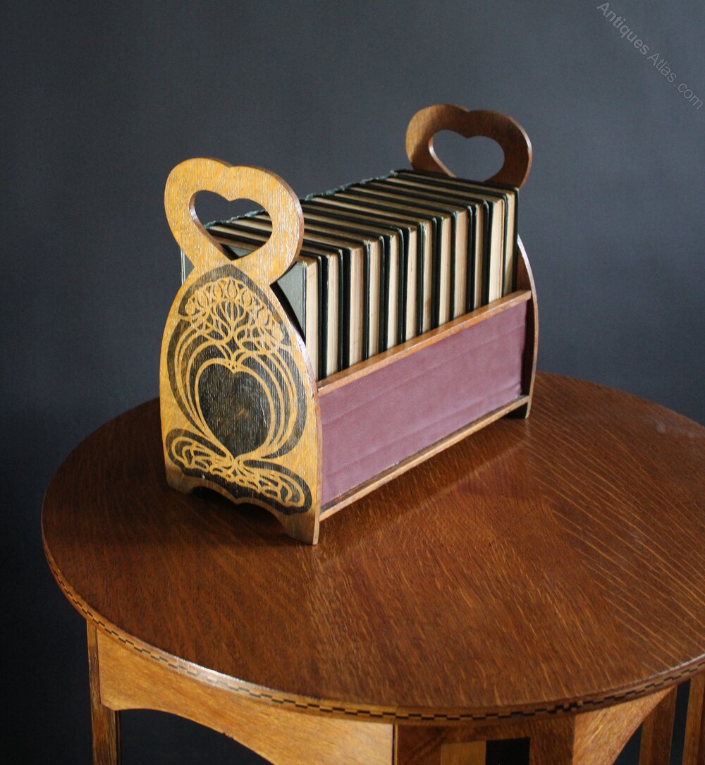 Arts and Crafts stencilled book trough in oak. Measures 28.75 cm high x 32 cm wide x 16.5 cm deep