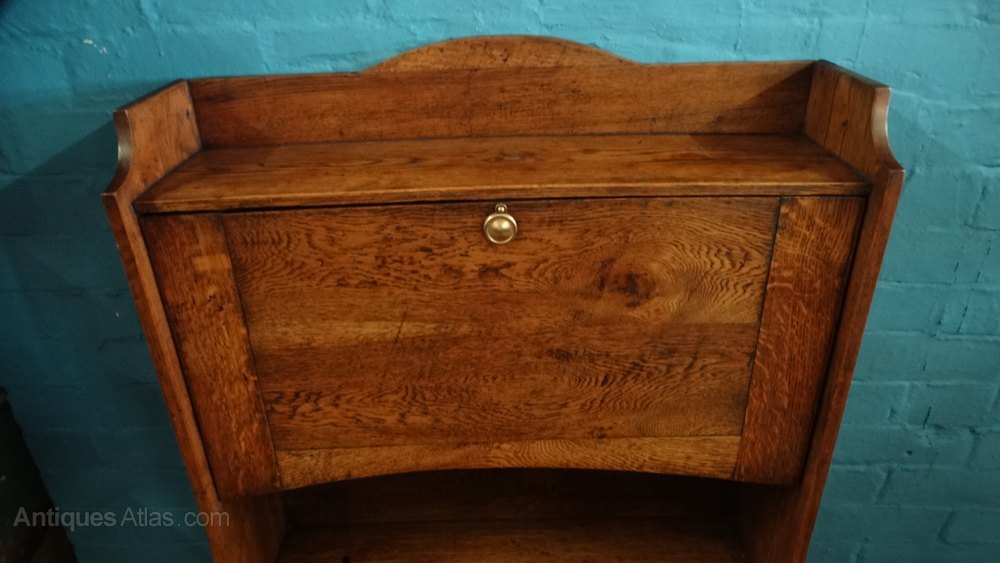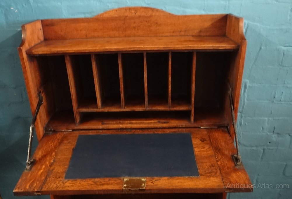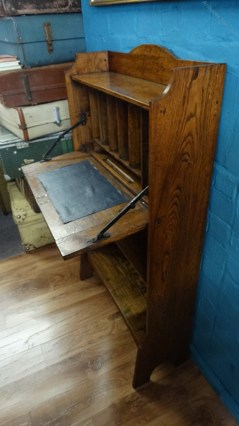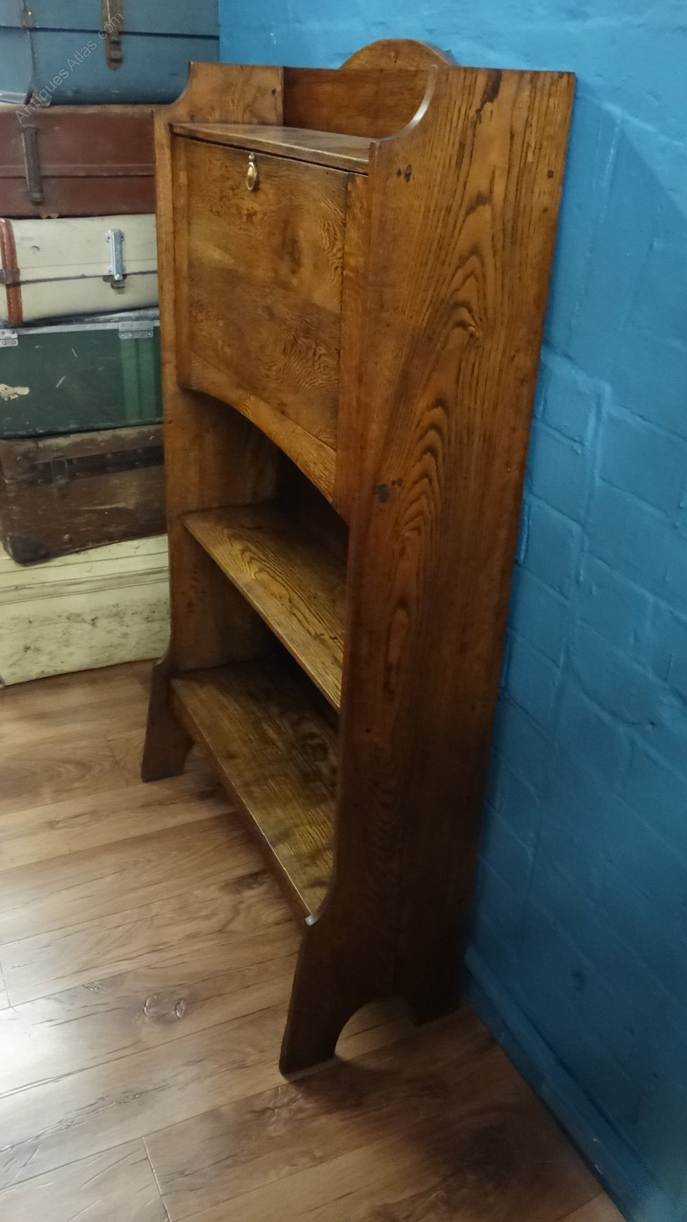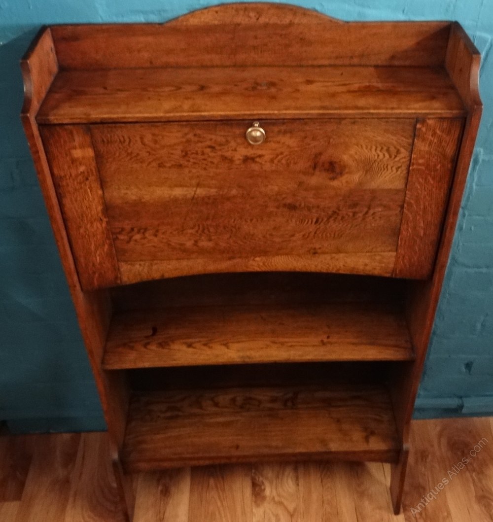 A stylish arts and crafts students fall front bureau bookcase in oak with working lock and nicely fitted out interior