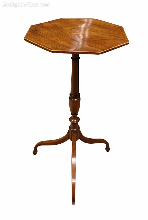 This elegant Regency occasional table dates to circa 1825 and is a fine example of the restrained sophistication characteristic of the period. Constructed in richly figured mahogany, the table is topped with an octagonal surface, beautifully enhanced by delicate satinwood stringing that follows the outline of the top, providing a subtle yet refined decorative contrast.