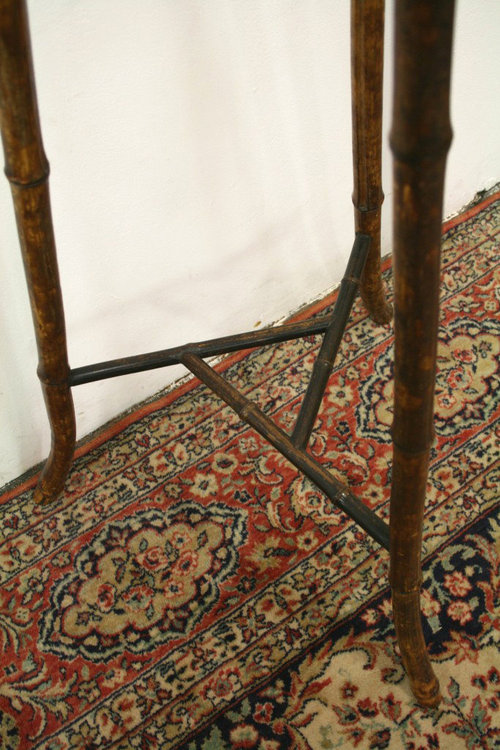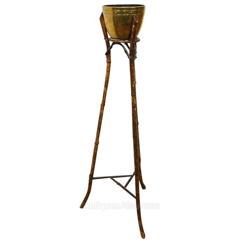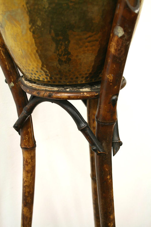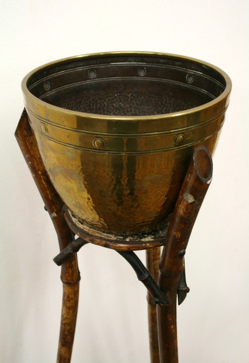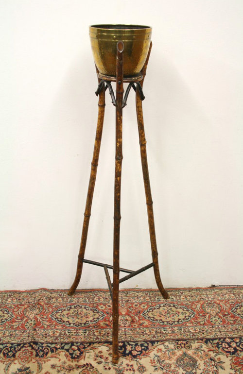 Circa 1890, original bamboo jardinière stand with embossed brass jardinière. Stylish original items.