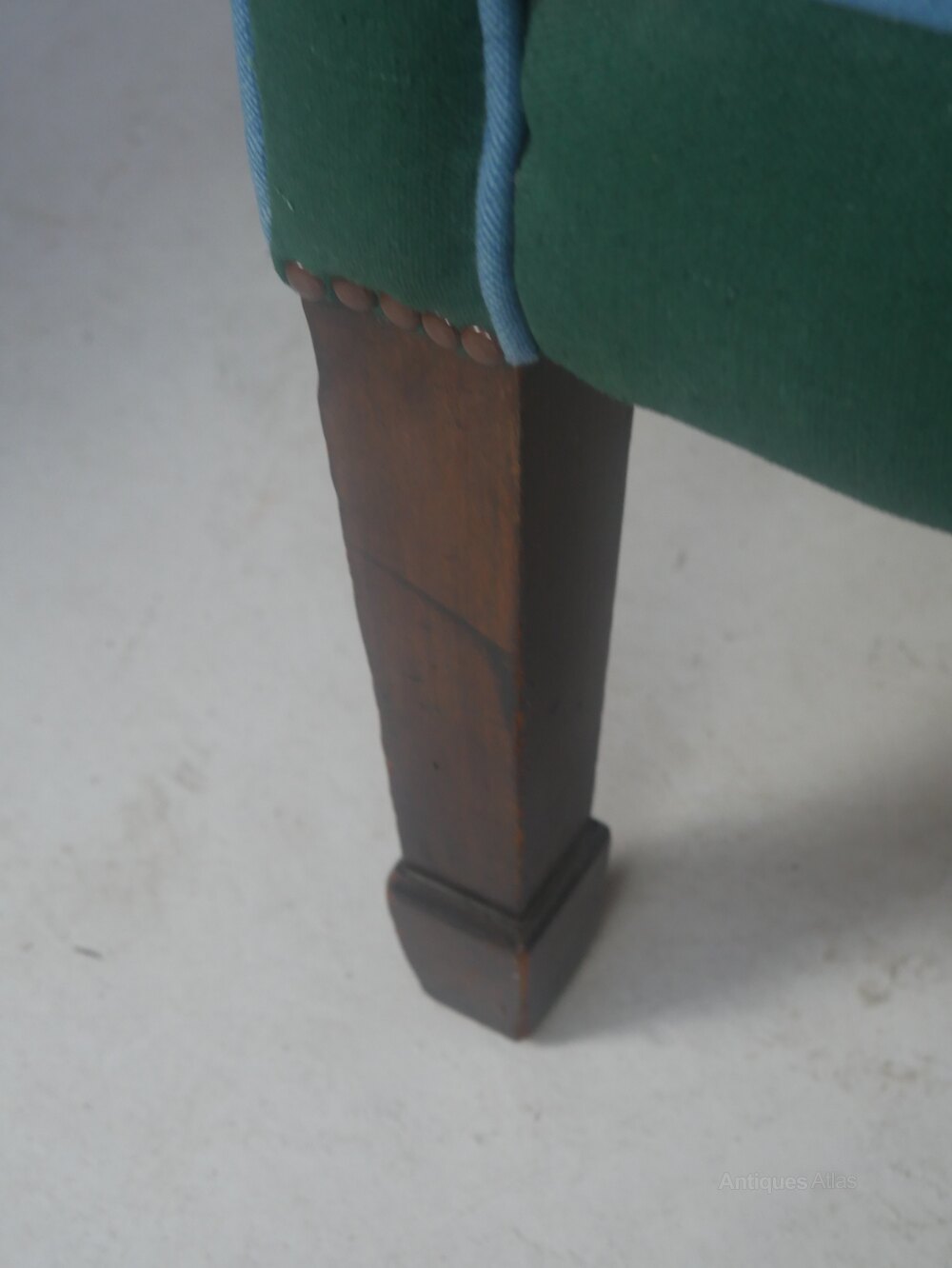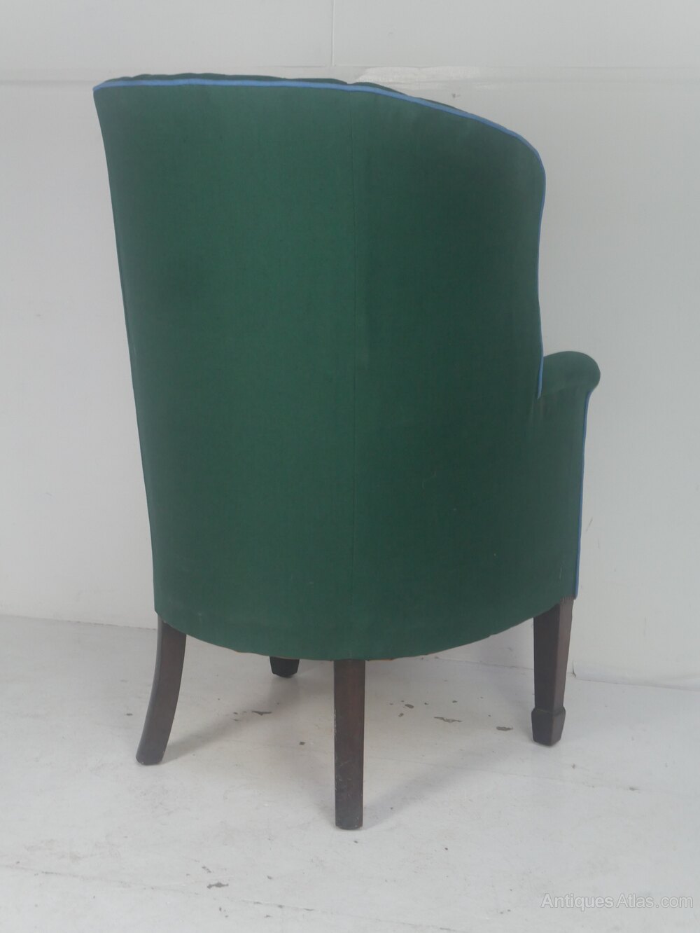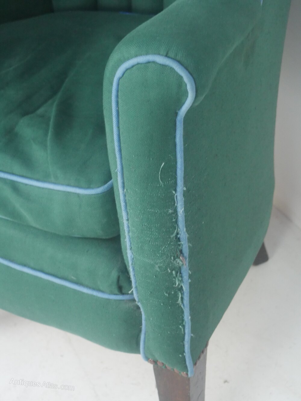 A very comfortable high backed armchair for upholstery. The chair in good strong condition, with a loose cushion, tapered mahogany front legs and splayed back legs, very snug and comfortable with a seating height of 54cm, made around 1900.