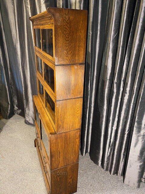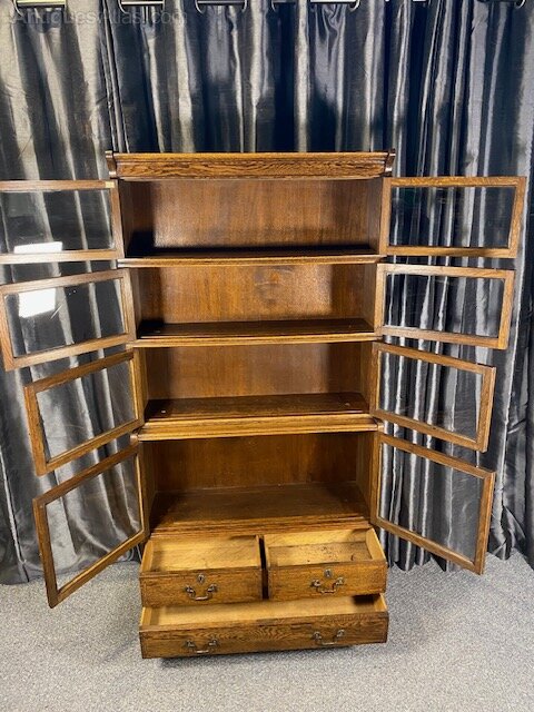The classic stacked , sections have glazed mottled glass that slide smoothly into the case , the base has drawers below for extra storage ideal for book or collectors items.