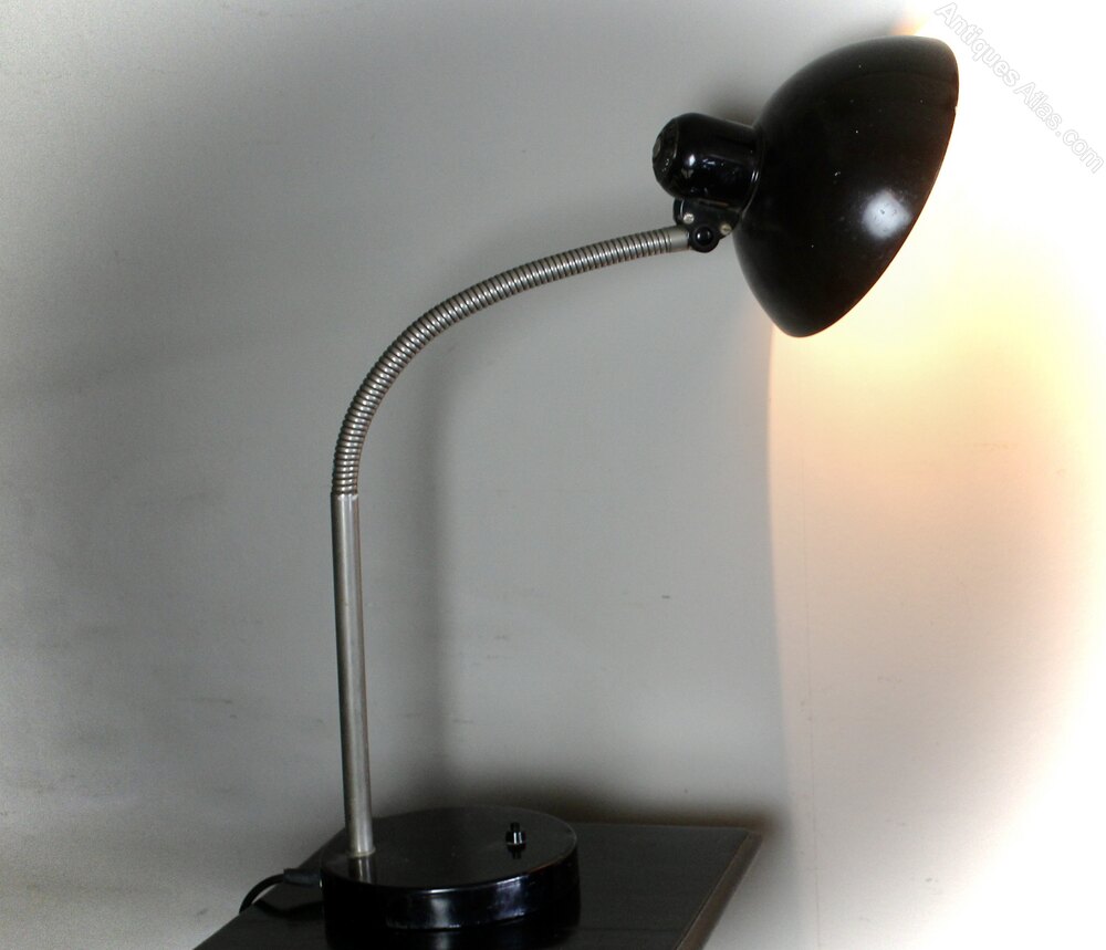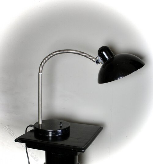 The Kaiser Idell Model 6561 is an iconic Bauhaus desk lamp designed by Christian Dell for Kaiser & Co. in the 1930s. Known for its functionalist, industrial design, it features a characteristic gooseneck arm for flexibility, a distinctive dome-shaped shade, and often includes the "Original Idell" stamp. Measures 43 cm high x 42 cm x 16 cm