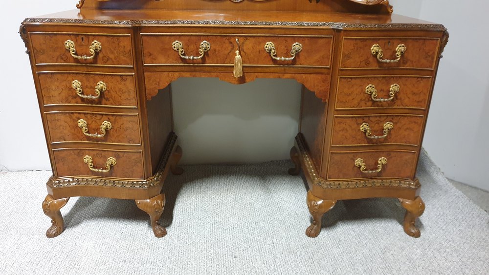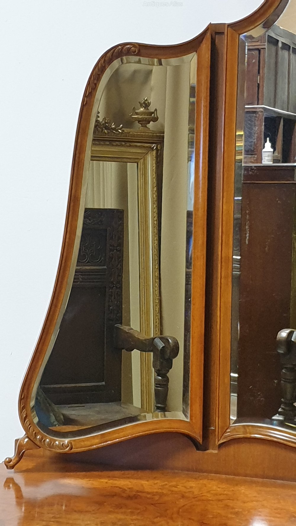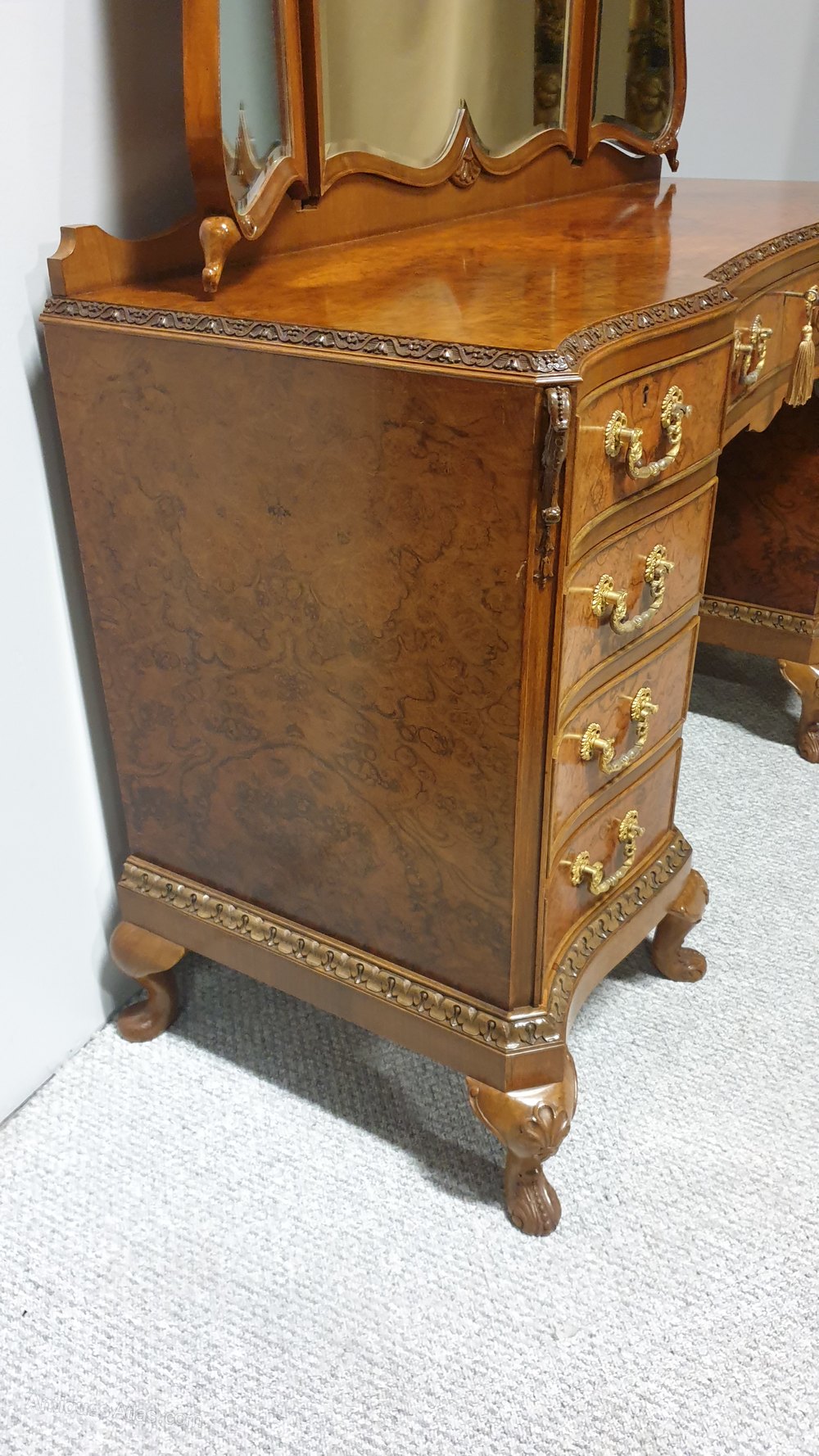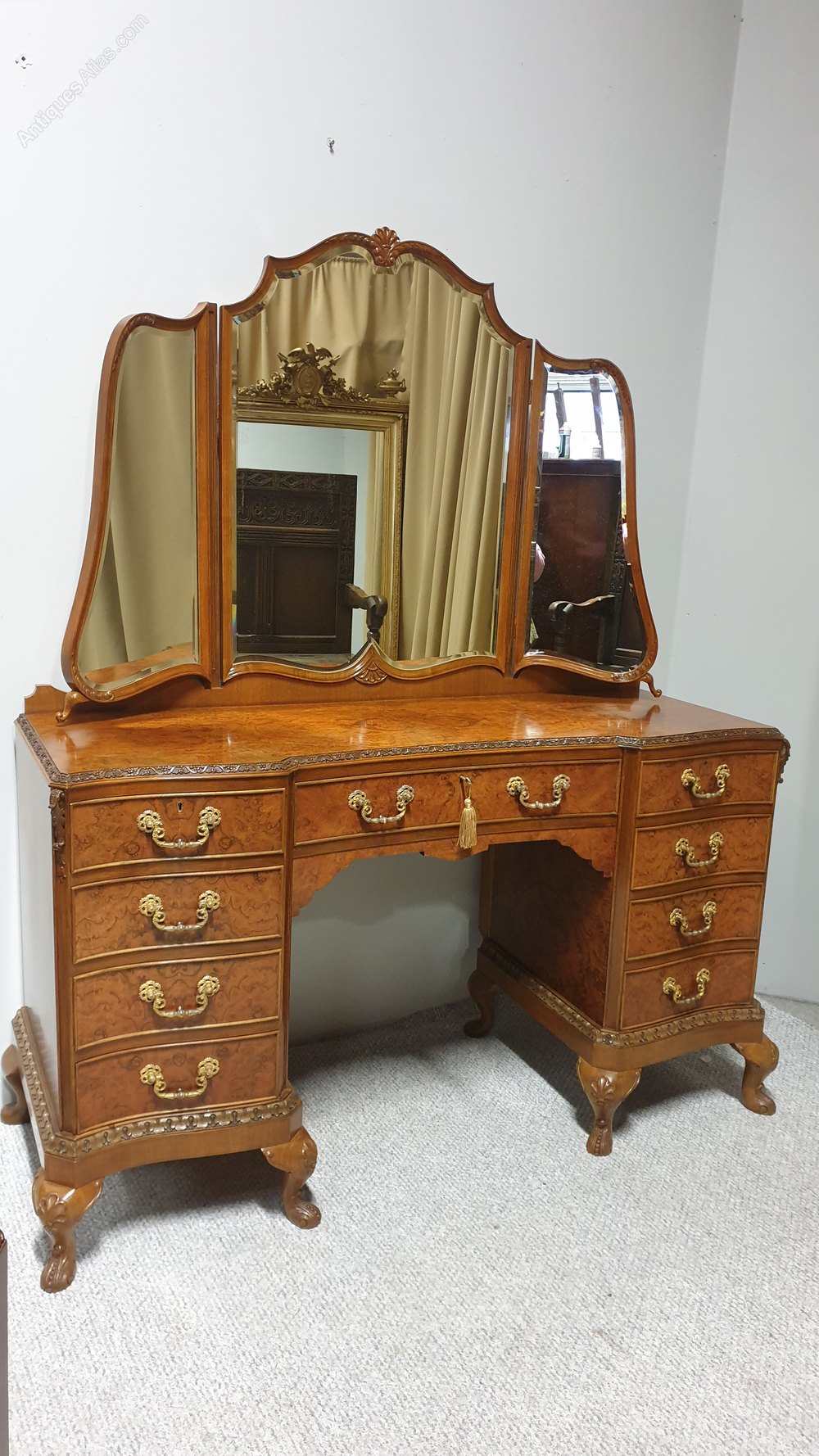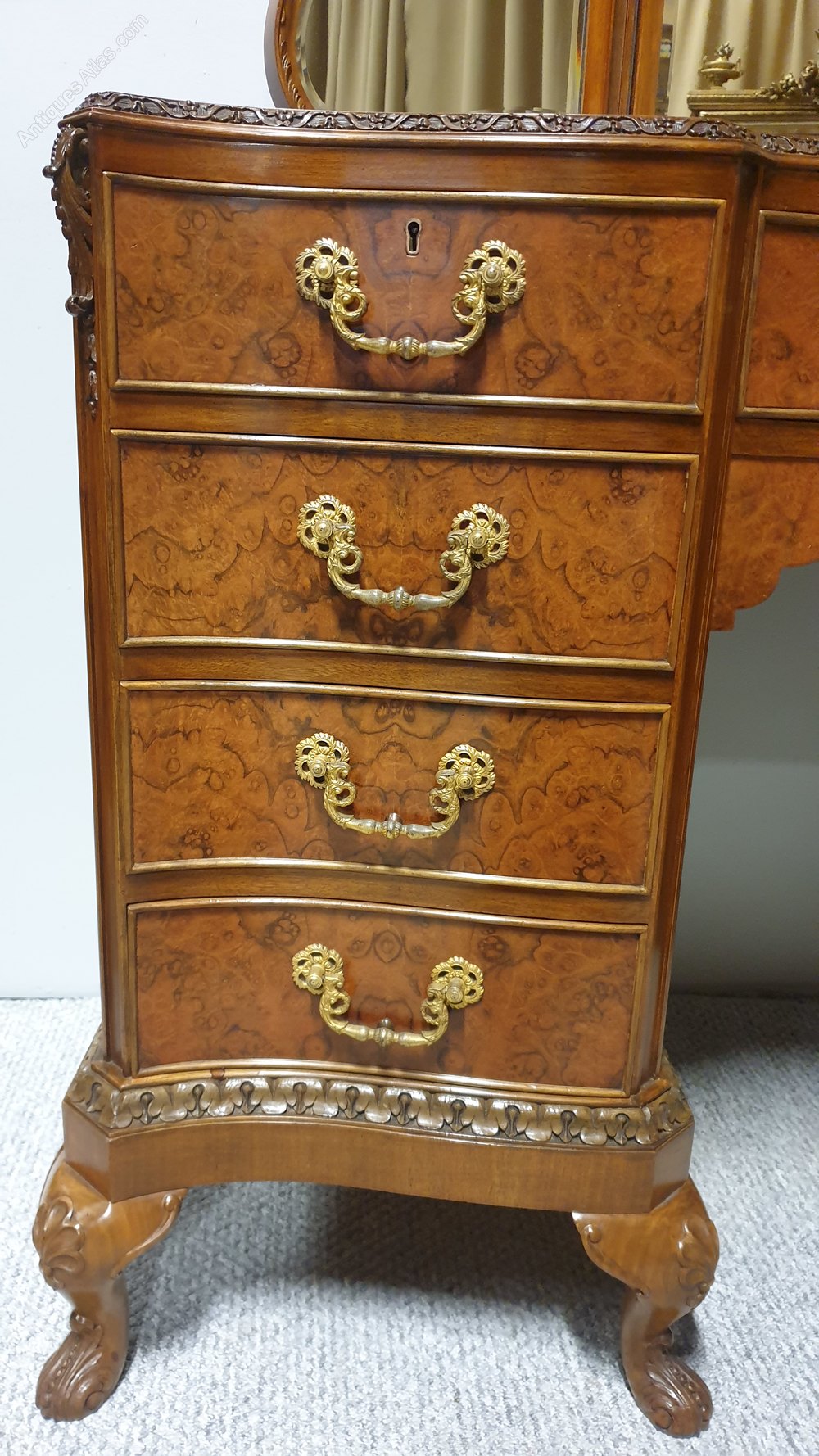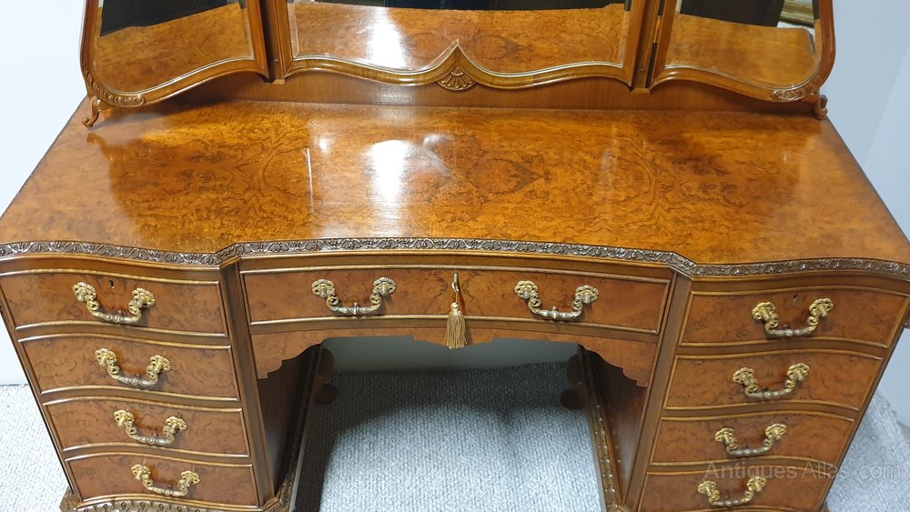A top quality burr walnut dressing table made by Heaton Tabb & Co Ltd, London, burr walnut to all sides, serpentine fronted, gilt metal handles, framed tryptic mirror with slight foxing, standing on carved walnut stubby legs, wonderful carvings, excellent colour and original condition.