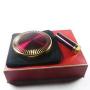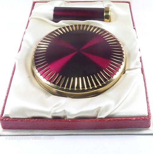 The powder compact and lipstick holder are decorated with deep pink enamel.